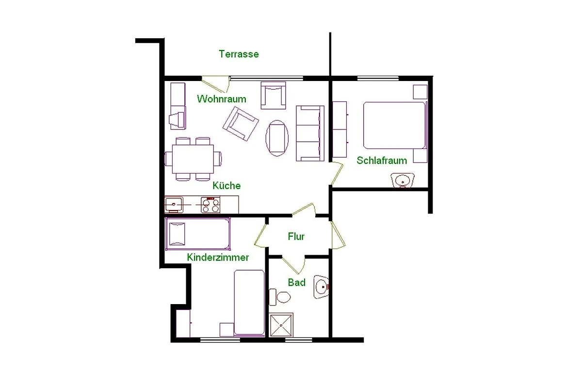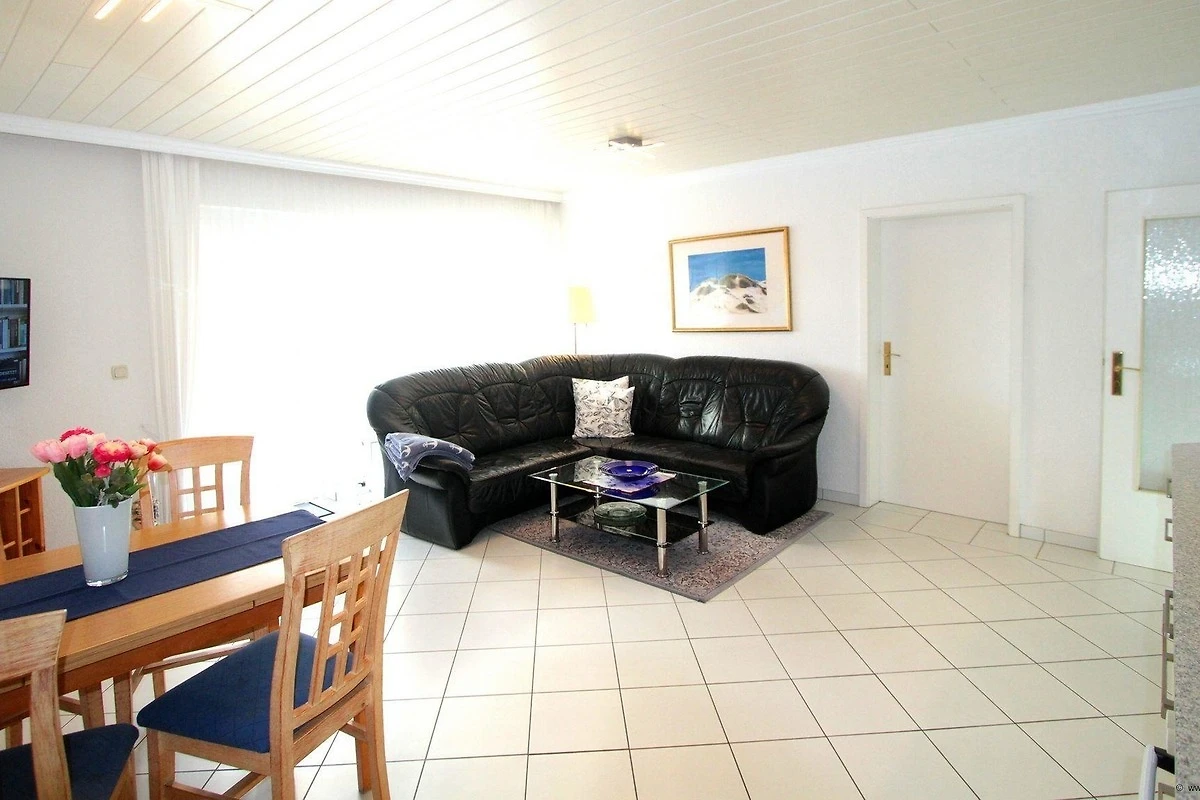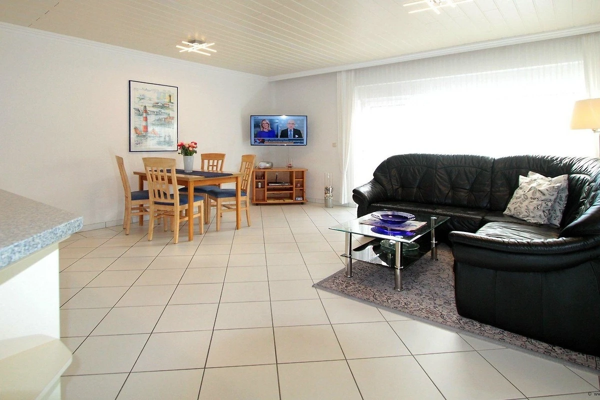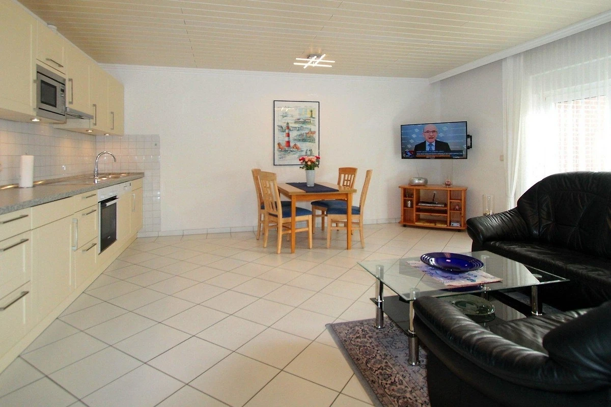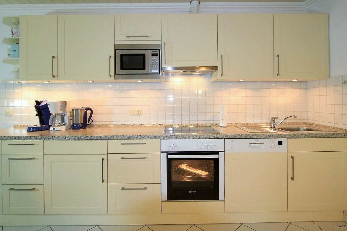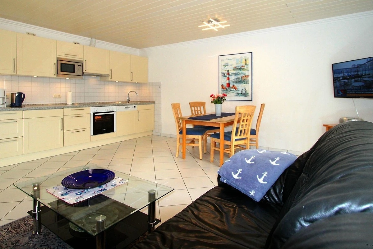 Im Wohnraum erwarten Sie eine Ledercouch , LCD Fernseher, DVD- Player und eine Stereoanlage. Die Küchenzeile ist mit folgenden ausgestattet: Herd mit Ceranfeld, Backofen, Mikrowelle, Kühlschrank, Geschirrspülmaschine, Kaffeemaschine, Wasserkocher, Mixer, Eierkocher sowie ausreichend Töpfe, Besteck und Geschirr für 5 Personen. Ein Esstisch mit 5 Stühlen steht für Sie bereit. Ein Kinderhochstuhl kann auf Anfrage gestellt werden. Das Duschbad (walk in Dusche) mit Fenster bietet genug Platz für Ihre Utensilien.
