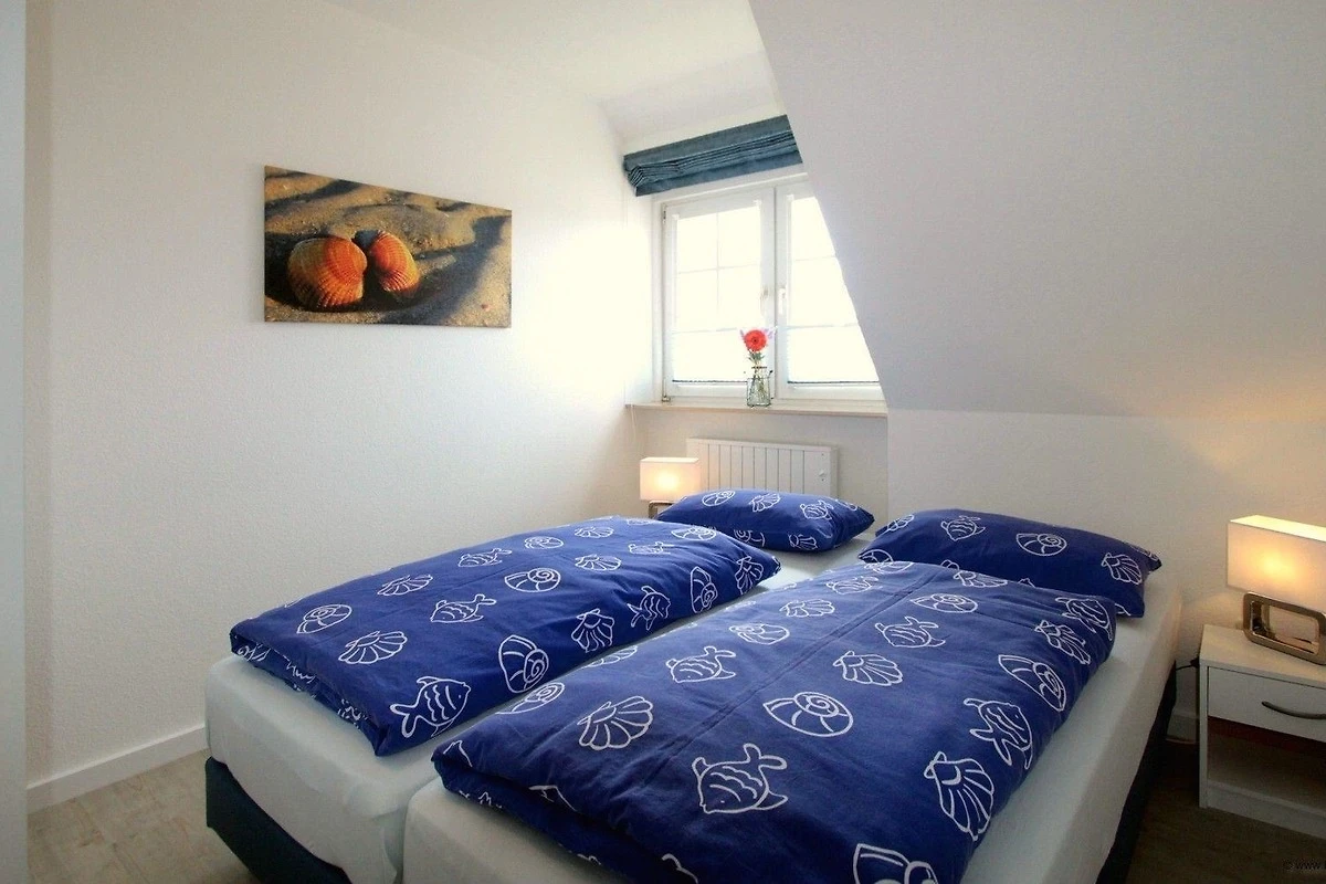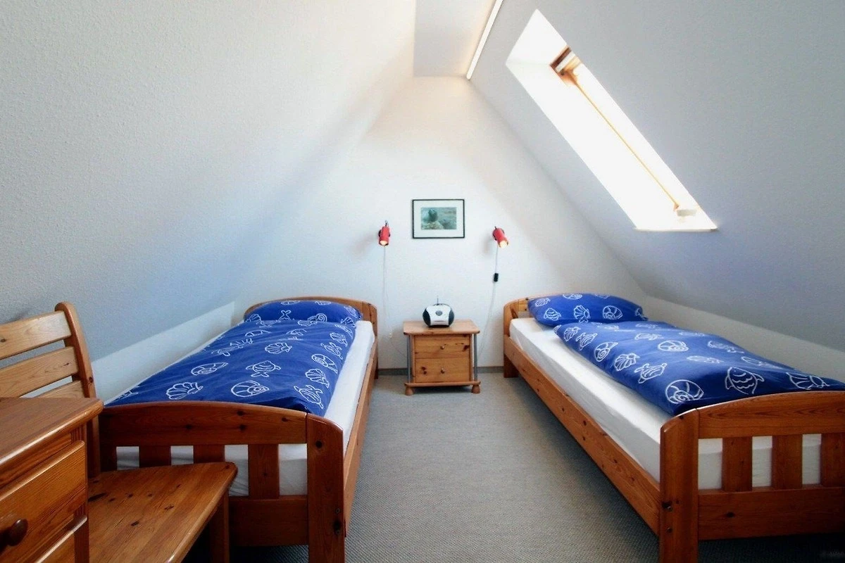 Das Kinderzimmer mit zwei Einzelbetten ist über eine Treppe zu erreichen.