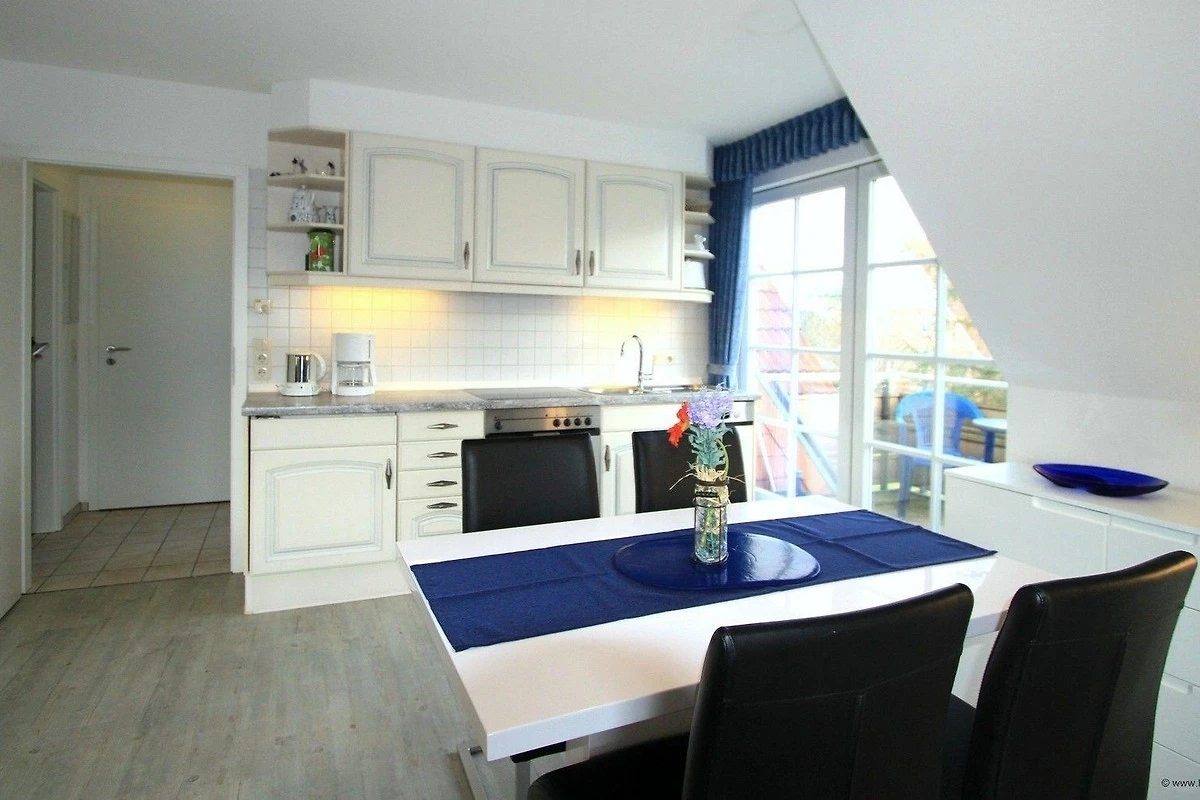 Auf der Wohnebene befindet sich das grosse Wohnzimmer mit offener Küche. Dort können Sie sich bei einem gemütlichen Fernsehabend oder einem ausgiebigen Dinner mit Ihren Lieben entspannen. Auch der Zugang zu den beiden Balkonen ist von diesem Wohnbereich erreichbar. Der Küchenbereich ist top-modern und bietet Selbstversorgern besten Küchenkomfort: Kochutensilien, Spülmaschine und vieles mehr stehen dort für Sie bereit.