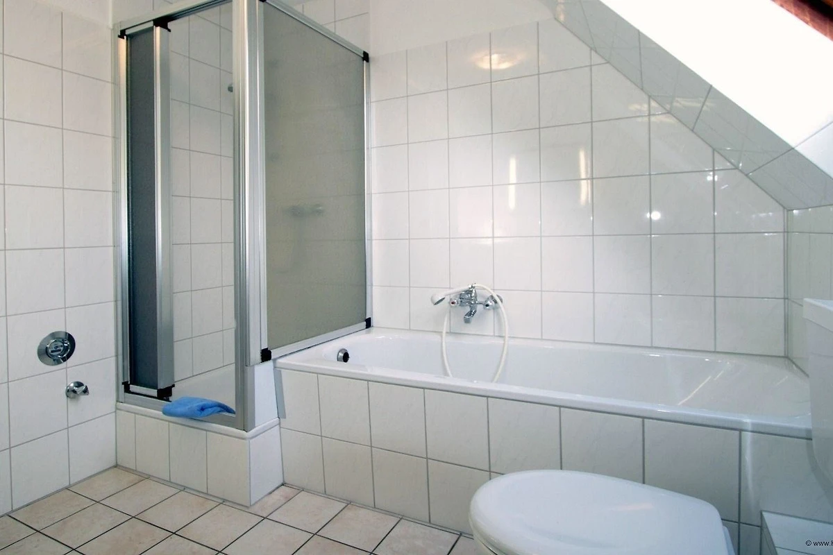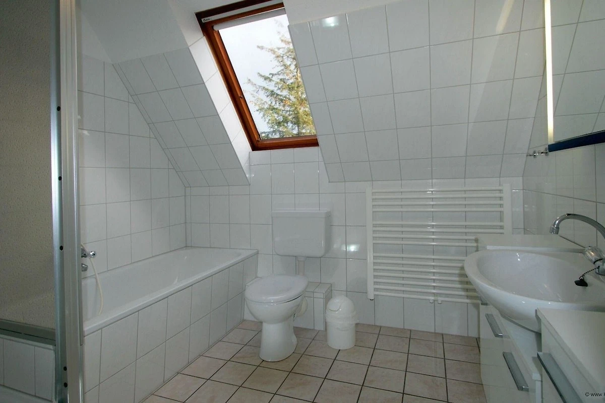 Der komfortable Charakter der Unterkunft setzt sich im Badezimmer fort. Das Design ist schlicht, aber edel. Ein schöner Spiegelschrank, Badewanne extra Dusche und Waschbecken, WC und Handtuchtrockner sind vorhanden.