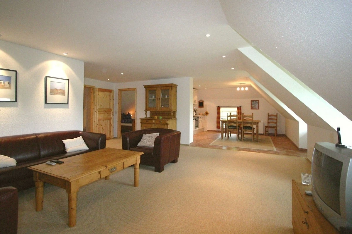 Das Wohnzimmer ist geräumig und verfügt über eine offene Küche. Fernseher, bequeme Polstersitze und der grosse Esstisch laden zum schnacken und klönen ein.