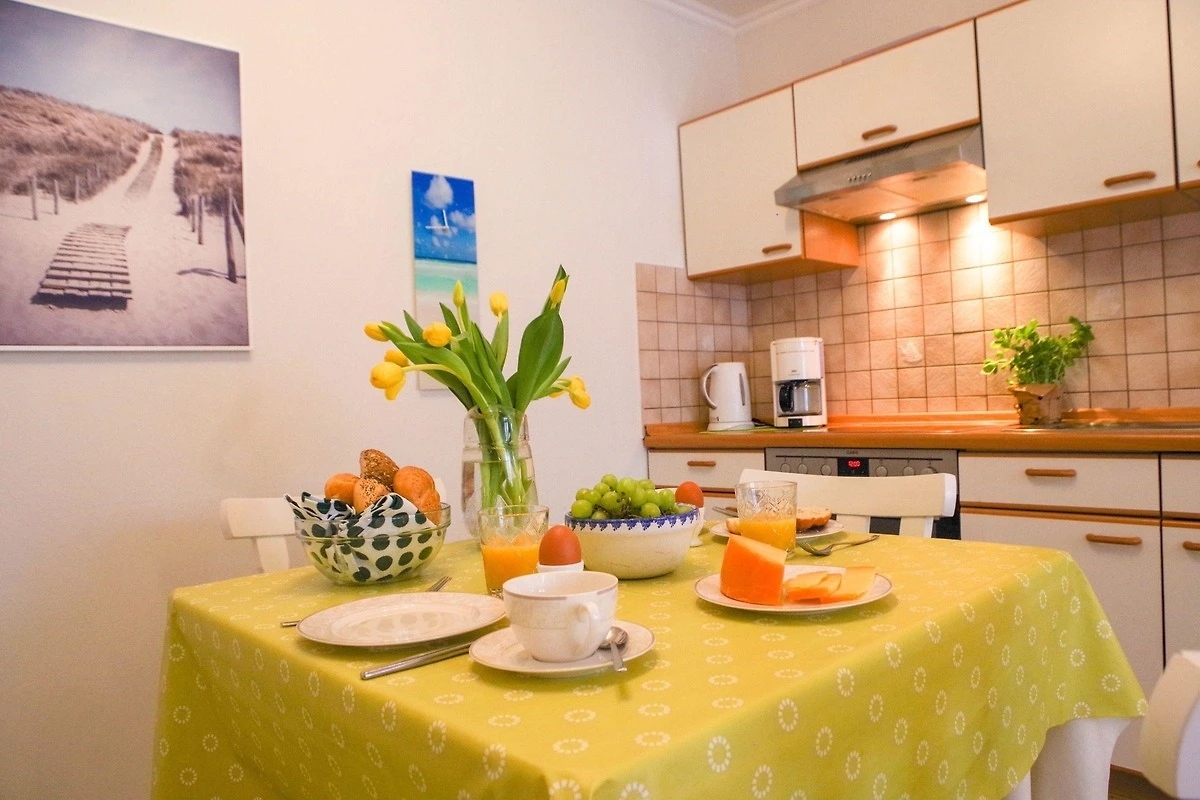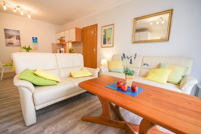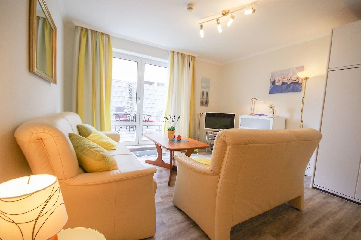 Diese strandnahe, gemütliche Ferienwohnung im Erdgeschoss bietet auf 47 qm Platz für bis zu 4 Personen und eignet sich ideal für einen Familienurlaub. Die Wohnung verfügt über ein separates Schlafzimmer sowie einen Wohnraum mit einer Küchenzeile und einem grossen Klappbett. Ein Highlight ist die grosszügige Terrasse, die mit Gartenmöbeln ausgestattet ist und zum Entspannen einlädt. Zudem besteht die Möglichkeit, den Garten gemeinschaftlich zu nutzen. Für den PKW ist in der Tiefgarage ein Stellplatz vorhanden; zusätzliche Parkmöglichkeiten sind vor dem Haus verfügbar. Wlan kann optional genutzt werden. Die Entfernung zum Strand beträgt etwa 10 Gehminuten. Die Kurtaxe variiert zwischen €1,20 und €2,90 pro Person und Tag, abhängig von der Kurzone und Saison.