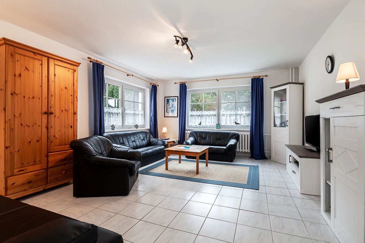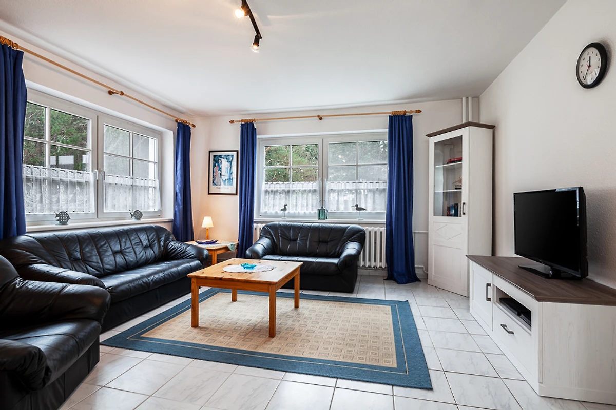 Das grosse lichtdurchflutete Wohnzimmer mit einer gemütlichen Couch bietet Ruhe und Entspannung. Ein TV-Flachbildschirm und eine Stereoanlage sorgen für die musikalische Unterhaltung.