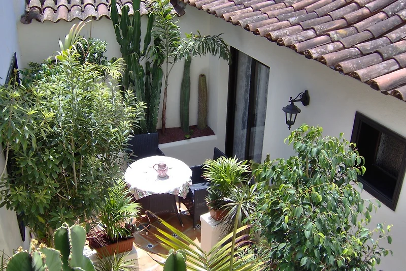 Die geräumige im rustikalen Stil eingerichtete Ferienwohnung verfügt über eine Küche, ein bequemes Wohnzimmer mit Essecke, ein geschmackvoll eingerichtetes Schlafzimmer, und eine wunderschöne Sitzgelegenheit auf der liebevoll gestalteten Innenhof-Terrasse. Die Ferienwohnung befindet sich im Erdgeschoss, das Schlafzimmer ist ruhig zum Innenhof gelegen. Von hier aus gelangen Sie auch direkt auf die Innenhof-Terrasse. Das kleine Wohnzimmerfenster bietet einen partiellen Meerblick und liegt zur Landstrasse. Der Flachbildfernseher verfügt über Satellitenempfang mit ca. 450 internationalen Sendern- darunter alle frei empfangbaren deutschen Kanäle - sowie durch Umschalten auf der Fernbedienung über DVB-T-Empfang mit den gängigen spanischen Fernsehsendern. Zudem kann auf Anfrage kostenlos Netflix bereitgestellt werden. Unser Haus verfügt über Internetanschluss per Glasfaser und in allen Unterkünften sowie auf der Dachterrasse steht sehr gut funktionierendes W-LAN zur kostenlosen Verfügung.