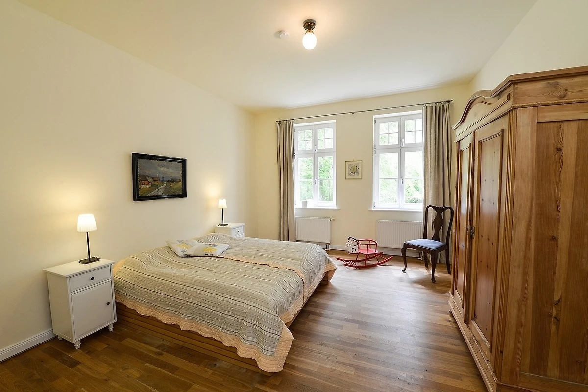 Die Ferienwohnung III des Gut Grubnow befindet sich im ersten Obergeschoss des Gutshauses. Die Wohnung für bis zu vier Personen und in einer Grösse von 92 m² ist geschmackvoll eingerichtet und besteht aus drei Zimmern: Ein grosses Wohnzimmer mit offener Küche (Siemens-Geräte) und schönem Blick auf den Garten, das Wasser und den Badesteg, zwei grosszügige Schlafzimmer mit jeweils einem Doppelbett und einem Badezimmer mit Badewanne und Dusche. Die Böden der Ferienwohnung bestehen aus Eichen-Parkett. Vom Wohnzimmer hat man einen sehr schönen Blick auf den Garten und das Wasser.