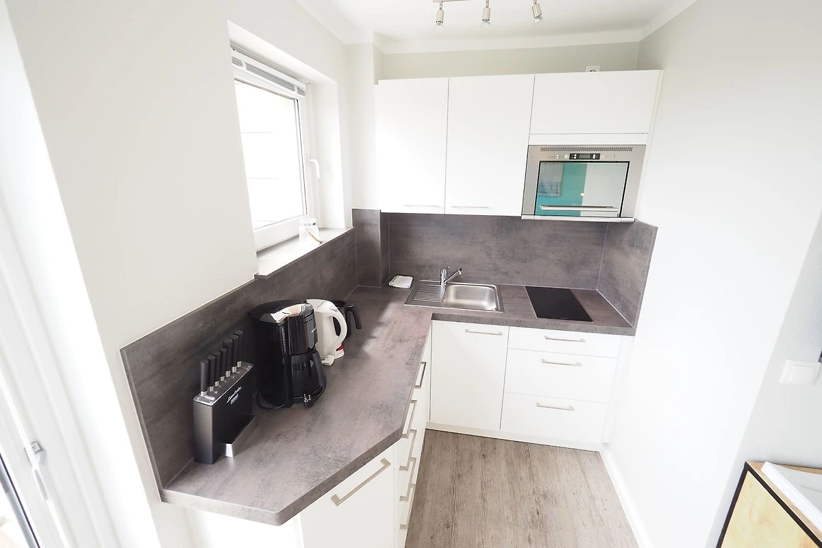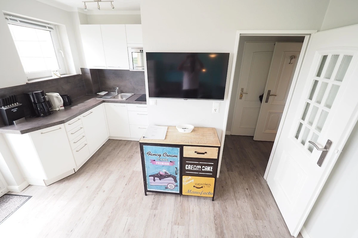 Küchenzeile: Die offene Küchenzeile ist funktional eingerichtet mit einem 2-Platten-Cerankochfeld, einem Mikrowellengrill und einem Kühlschrank – ideal für die Zubereitung kleiner Mahlzeiten oder Snacks.