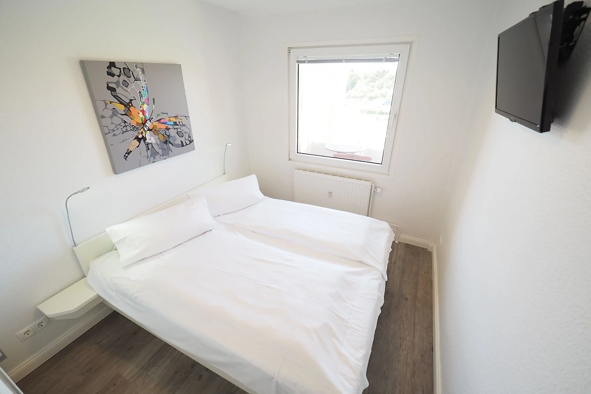 Schlafzimmer: Das Schlafzimmer bietet ein bequemes Doppelbett (160x200 cm) mit getrennten Matratzen, das für erholsame Nächte sorgt.
