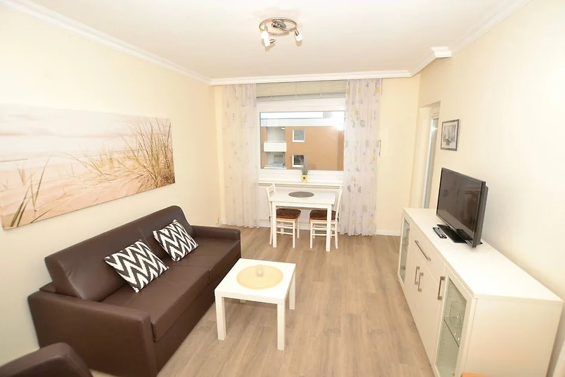 Das gemütliche Wohnzimmer ist mit einer bequemen Schlafcouch ausgestattet, auf der Sie sich nach einem erlebnisreichen Tag entspannen können. Der TV sorgt für Unterhaltung, während die Essecke ideal für gemeinsame Mahlzeiten oder entspannte Abende ist.