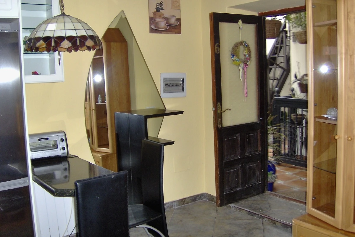 Die im modernen Stil eingerichtete Ferienwohnung liegt im ersten Stockwerk direkt zur Landstrasse auf nahezu Strassenniveau (Vierfachverglasung). Der Wohnbereich verfügt über eine grosse moderne und voll ausgestattete Küche (inkl. Mikrowelle), eine Esstheke sowie ein bequemes Sofa. Das Schlafzimmer ist mit einem 150 cm grossen französichen Bett ausgestattet. Das direkt anschliessende Badezimmer hat eine Dusche. Der Flachbildfernseher verfügt über Satellitenempfang mit ca. 450 internationalen Sendern- darunter alle frei empfangbaren deutschen Kanäle - sowie durch Umschalten auf der Fernbedienung über DVB-T-Empfang mit den gängigen spanischen Fernsehsendern. Zudem kann auf Anfrage kostenlos Netflix bereitgestellt werden. Unser Haus verfügt über Internetanschluss per Glasfaser und in allen Unterkünften sowie auf der Dachterrasse steht sehr gut funktionierendes W-LAN zur kostenlosen Verfügung. Der geringe Preis erklärt sich durch die Lage zur Strasse, durch die Lärmbelästigungen nicht ausgeschlossen werden können. Für lärmempfindliche Menschen ist dieses Apartment nicht geeignet.