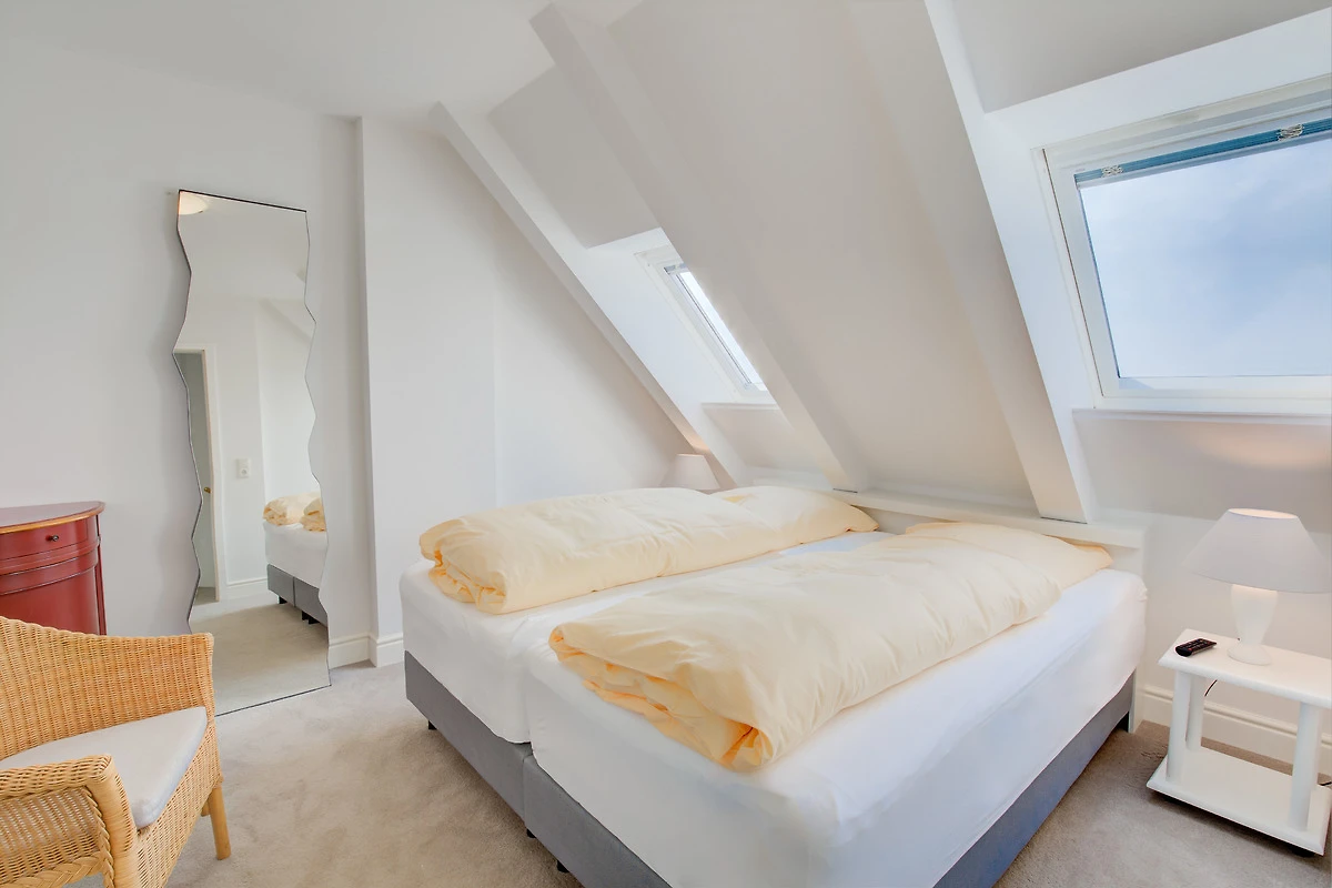 Über eine gut begehbare Treppe erreichen Sie das gemütliche Schlafzimmer unter Dachschrägen mit Boxspringbett und Fernseher.