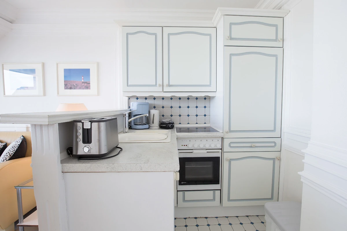 Sie gelangen direkt in den schönen, hellen Wohnraum mit komplett ausgestatteter Küche mit Geschirrspüler und Backofen.