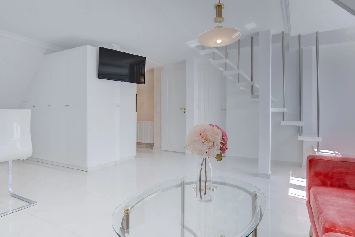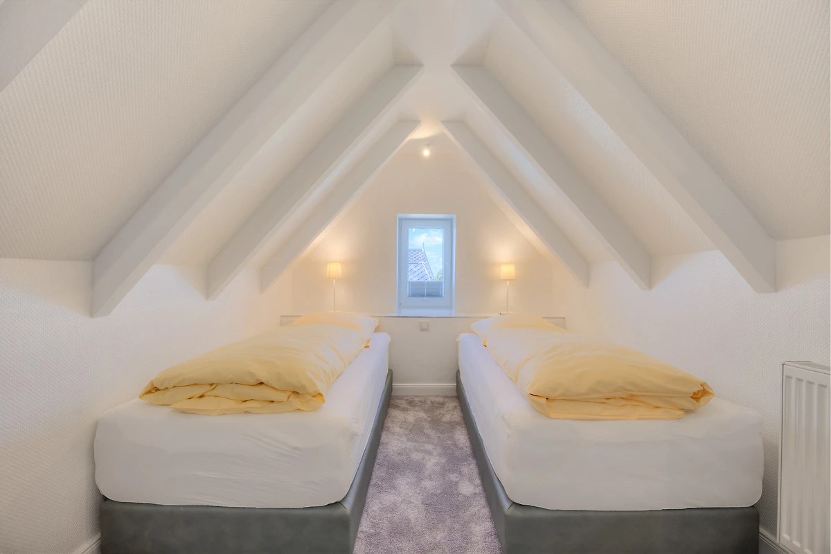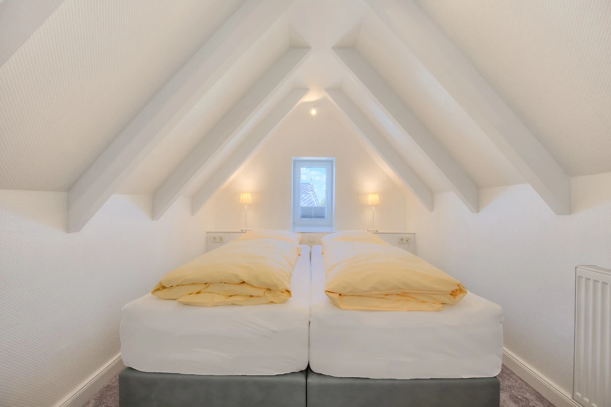 Über eine gut begehbare Treppe gelangen Sie vom Wohnzimmer in das gemütliche Schlafzimmer mit Boxspringbetten und Fernseher.