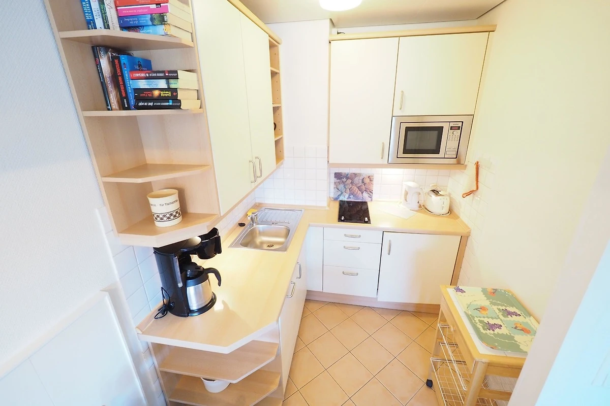 Die offene Küche ist funktional und modern ausgestattet: Ein 2-Platten-Cerankochfeld, Mikrowelle, Geschirrspüler und Kühlschrank stehen Ihnen zur Verfügung – ideal für die Zubereitung Ihrer Lieblingsgerichte.