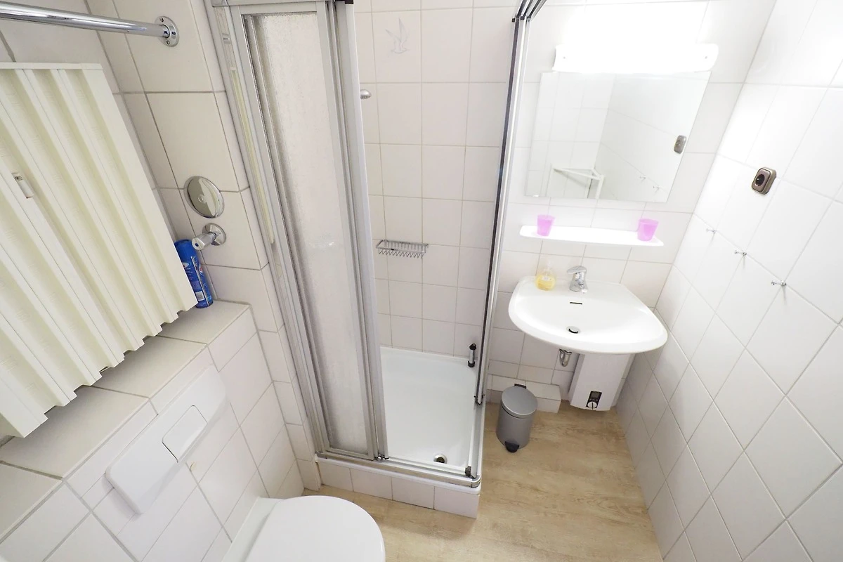 Das Schlafzimmer verfügt über ein komfortables Doppelbett (180 x 200 cm), das für eine erholsame Nachtruhe sorgt. Das Duschbad mit WC rundet das Angebot ab.