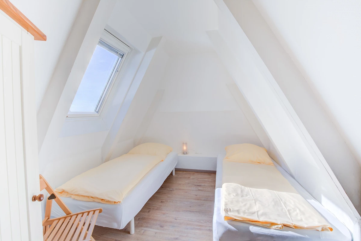 Unter Dachschrägen schlafen Sie entspannt in dem anderen Schlafzimmer mit Doppelbett und Fernseher. Für die Kleinen gibt es ein schönes Kinderzimmer mit zwei Einzelbetten. Zudem befindet sich auf dieser Ebene das zweite Duschbad.
