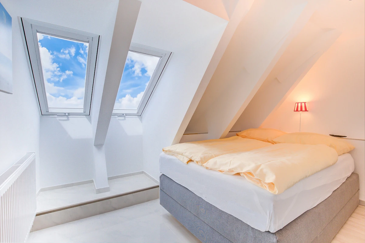 Einbauschränken für Ihre Urlaubsgarderobe sowie 2 Duschbäder befinden sich ebenfalls auf dieser Ebene. In dem darüber liegenden Dachgeschoss befinden sich zwei weitere Schlafzimmer mit einem tollen Ausblick über das Meer und die Heide.