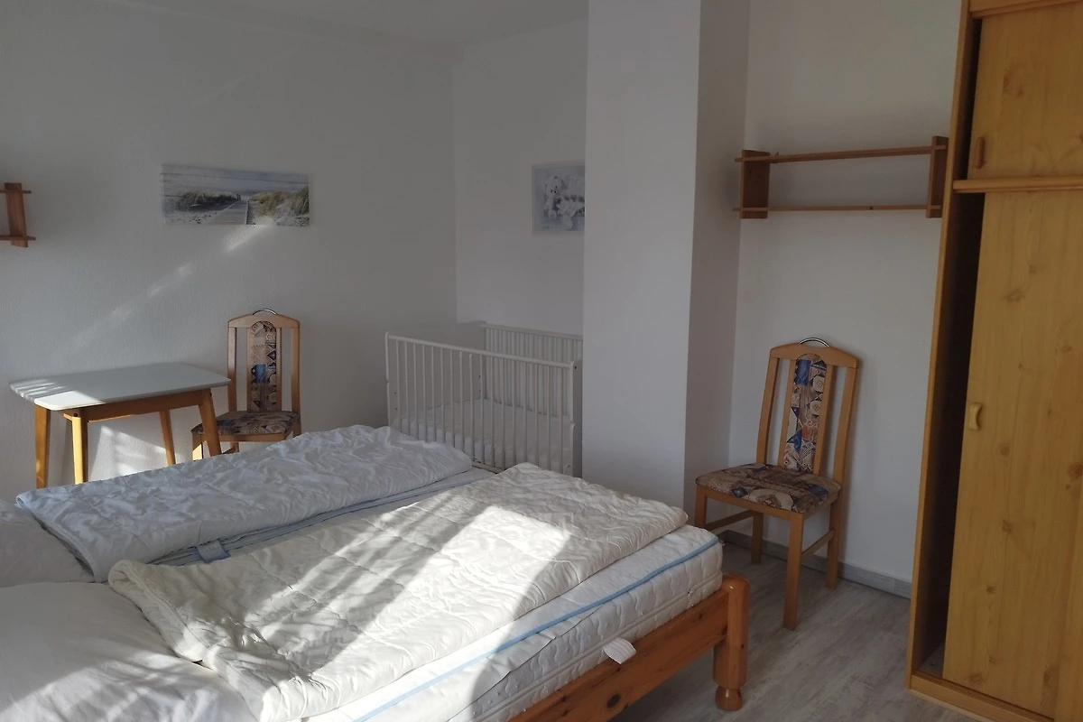Wohnzimmer bei 2 Pers. oder Wohnschlafraum bei 3 Pers. Ecksofa mit Schlaffunktion, . Essecke. Sat TV Flachbildschirm, Stereoanlage m. CD Spiele, Bücher. Schlafzimmer: Doppelbett (200x180), 1 Kinder- Gitterbett (140x70) Aussenrollladen.