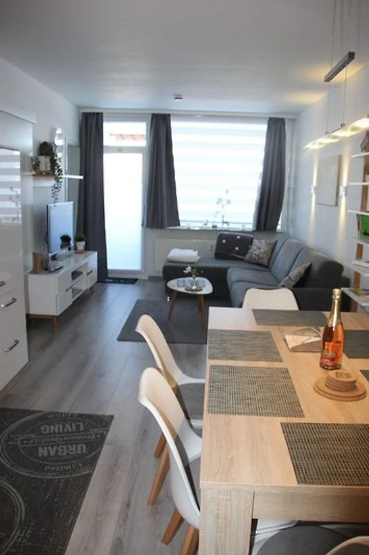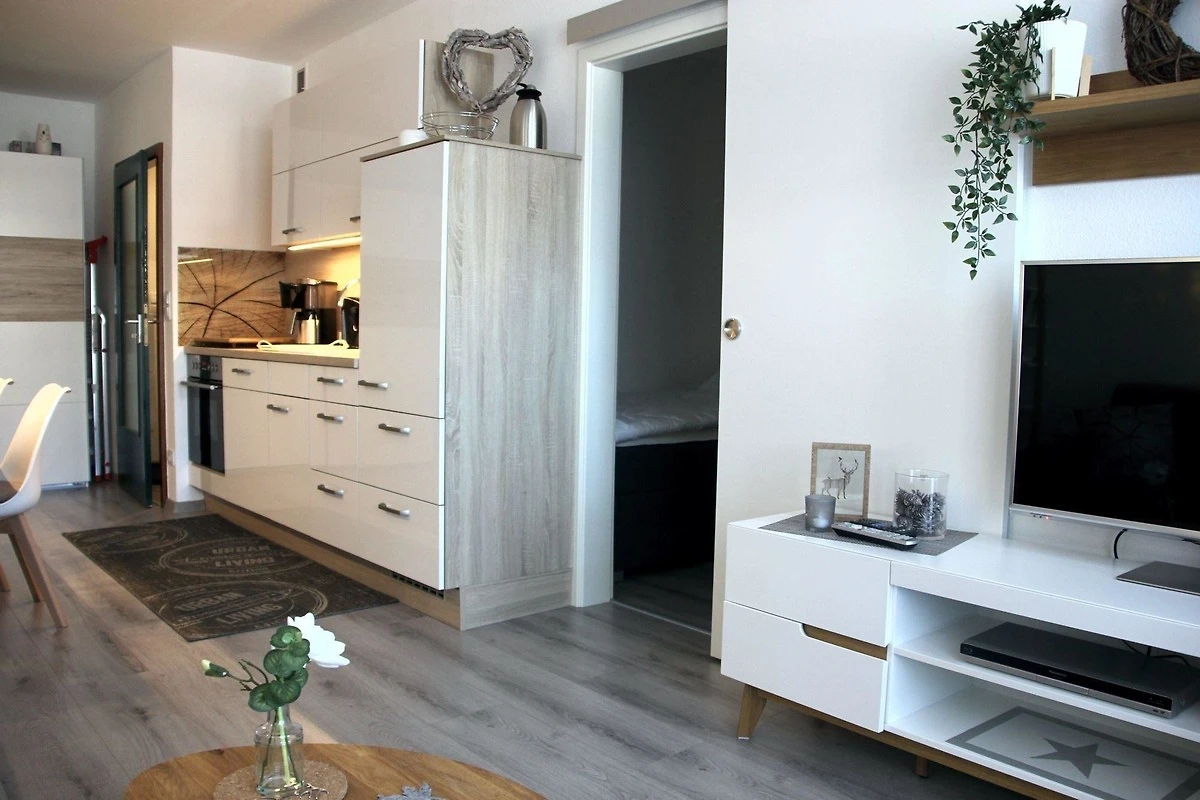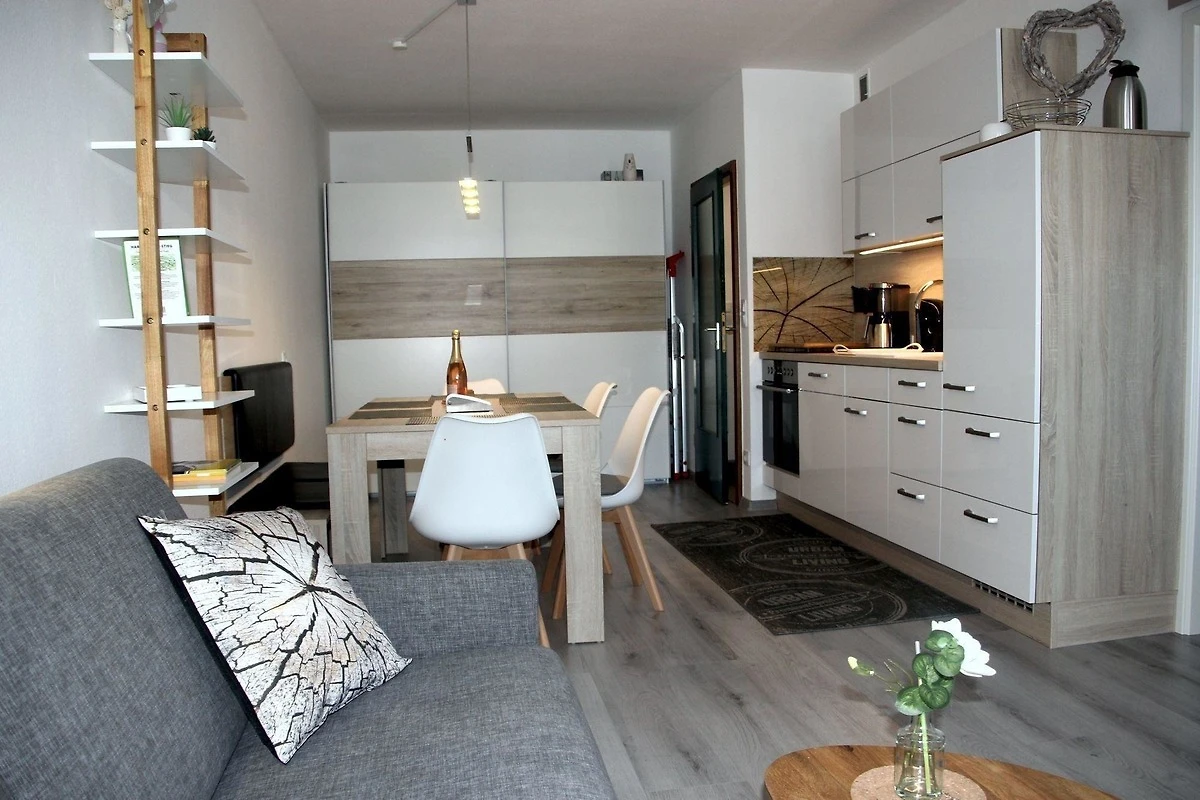 Die Ferienwohnung bietet eine moderne und komfortable Ausstattung auf hohem Niveau. In zwei Schlafzimmern finden sich insgesamt drei Einzelbetten, die für entspannte Nächte sorgen. Die offene Küche ist komplett ausgestattet mit einem Elektro-/Gasherd, Backofen, Kühlschrank, Geschirrspüler und einer Kaffeemaschine, um kulinarische Köstlichkeiten zu zaubern. Ein Esstisch lädt zu gemeinsamen Mahlzeiten ein. Das Badezimmer verfügt über eine Dusche und einen Haartrockner für zusätzlichen Komfort. Zur Unterhaltung stehen eine HiFi-Anlage und ein TV bereit. Praktische Annehmlichkeiten wie eine Waschmaschine, ein Wäschetrockner und ein Staubsauger sind ebenfalls vorhanden. WLAN mit 25 MBit/s sorgt für einen reibungslosen Internetzugang. Die Wohnung ist barrierefrei mit einem Fahrstuhl zugänglich. Reinigungsmittel sowie Geschirrtücher werden als Starterset bereitgestellt. Eine gemütliche Kombination aus Funktionalität und Stil erwartet die Gäste.