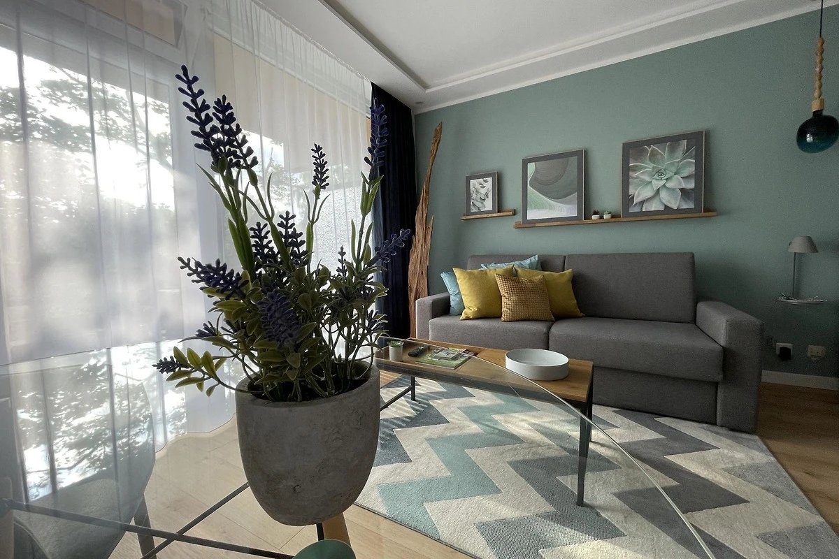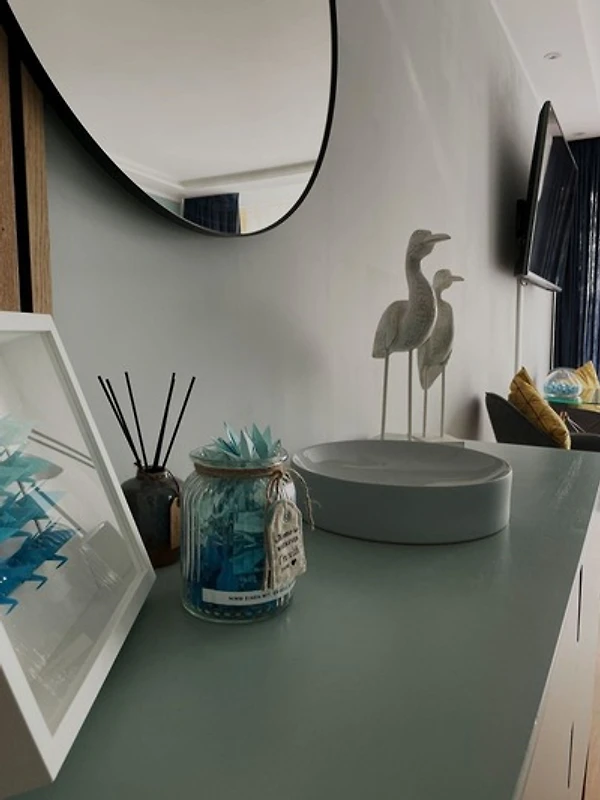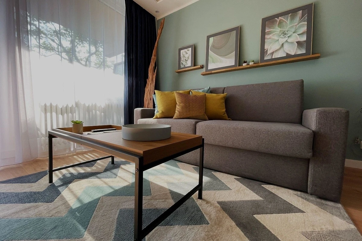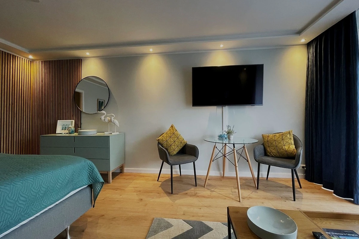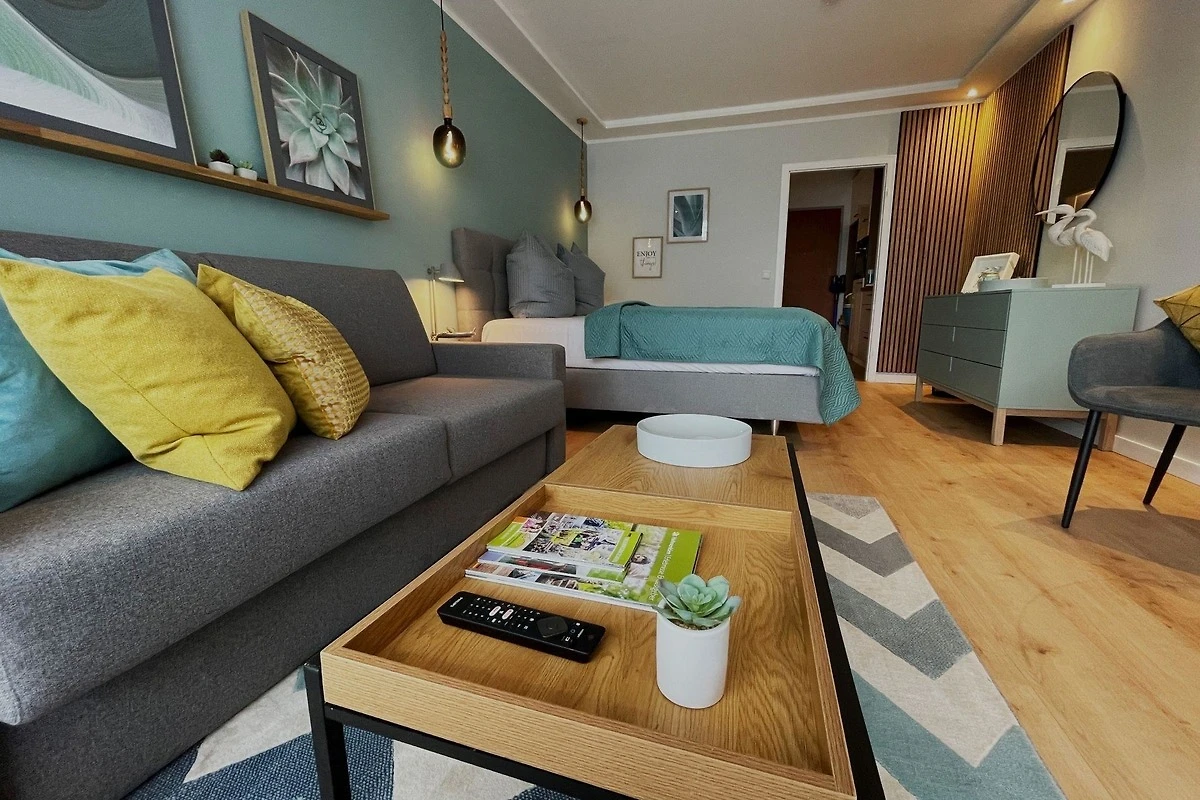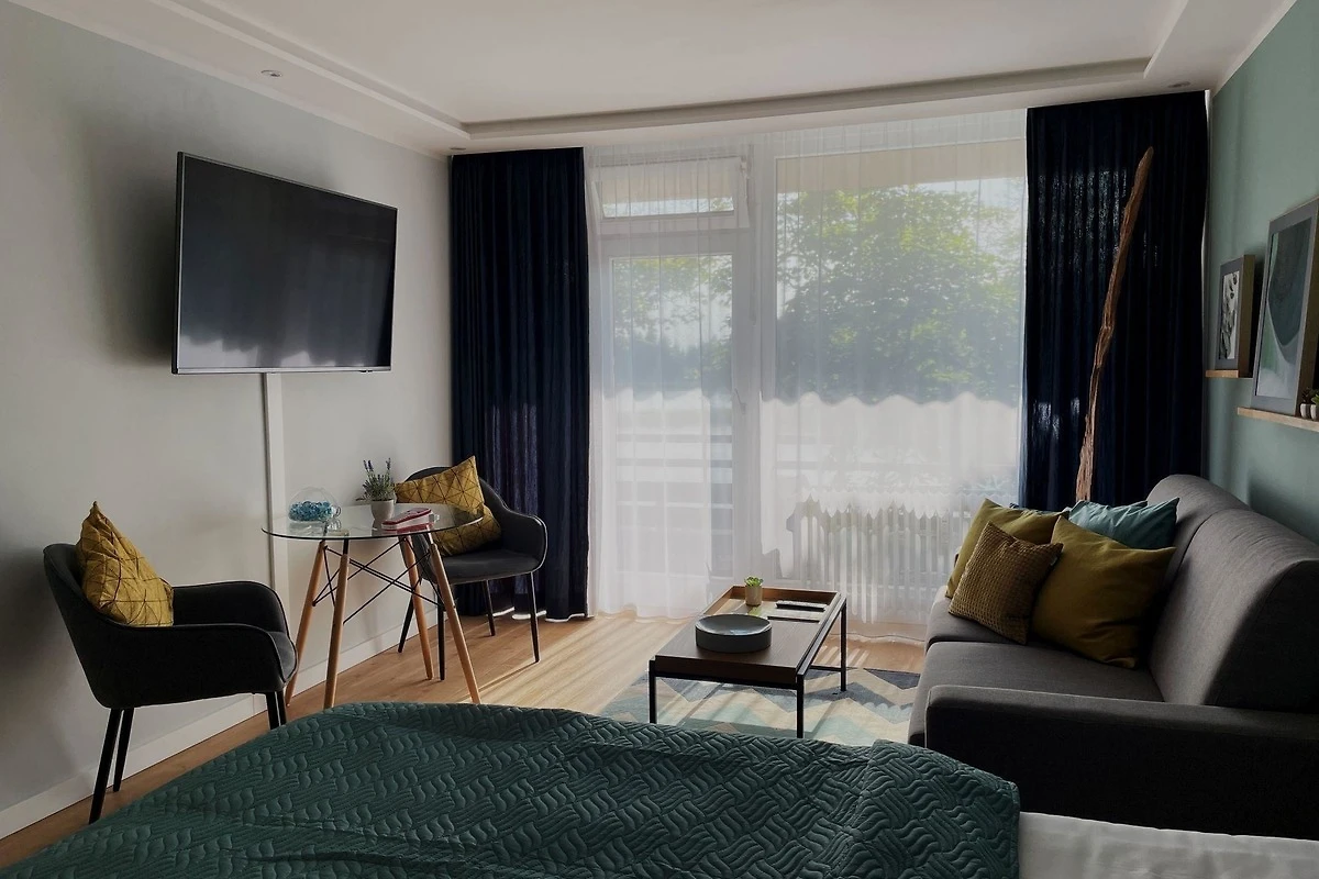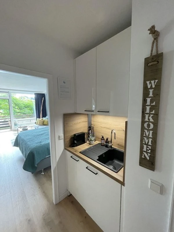 Die Küchenzeile ist ein Highlight der Wohnung und ist mit einem Elektro-/Gasherd, Backofen, Mikrowelle, Kühlschrank, Geschirrspüler, Kaffeemaschine, Toaster und einem Wasserkocher ausgestattet. Geschirr, Besteck und Geschirrtücher sind ebenfalls vorhanden, ebenso wie eine Gefriermöglichkeit. Eine gemütliche Sitzecke mit Sofa und ein Schreibtisch laden zum Entspannen und Arbeiten ein.