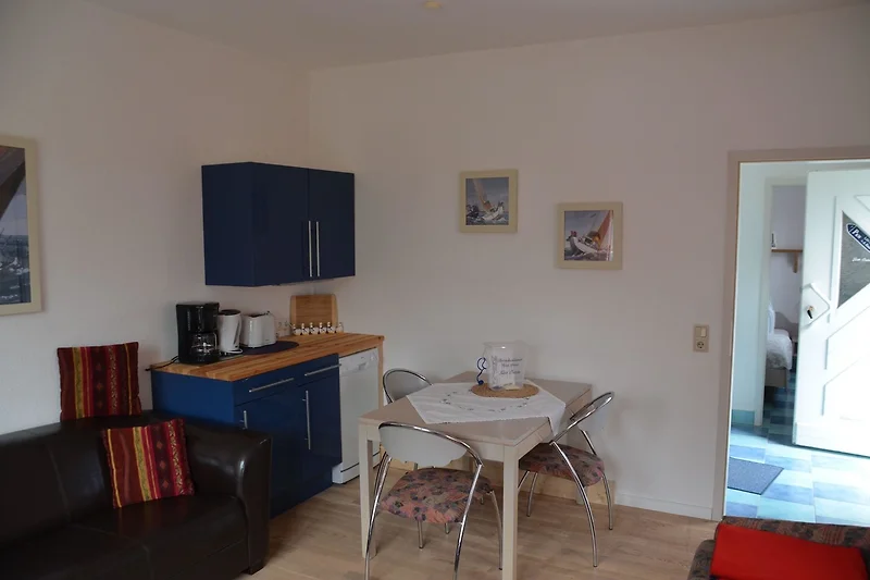 Küchenzeile mit Geschirrspüler, kleinem Ofen, Mikrowelle, Wasserkocher, Kaffeemaschine, Toster.
