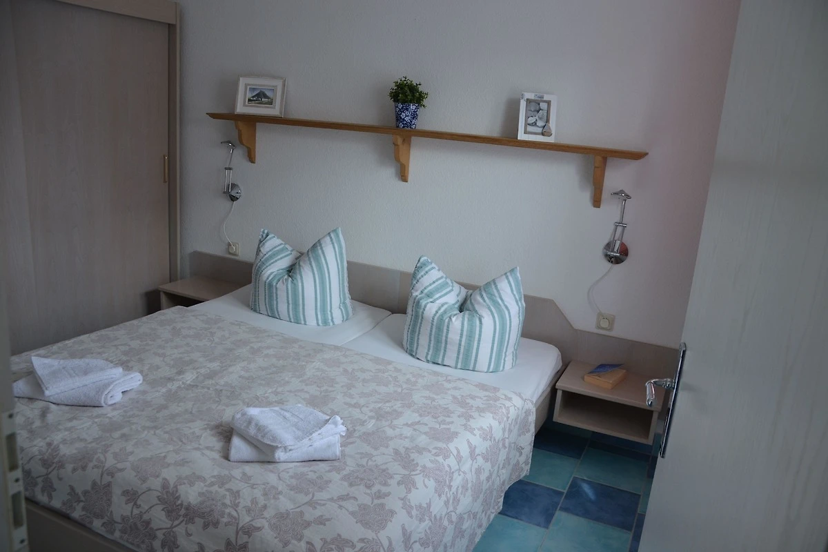 Schlafzimmer mit Doppelbett (180x200) und grossem Kleiderschrank.