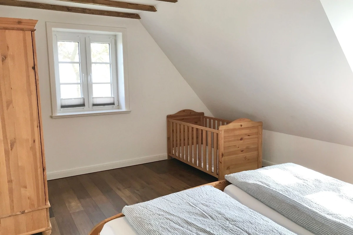 Im Obergeschoss befinden sich zwei Schlafzimmer (1 Schlafzimmer mit Doppelbett und Babybett, 1 Schlafzimmer mit ausziehbarem Bett) und das Badezimmer mit Regendusche.