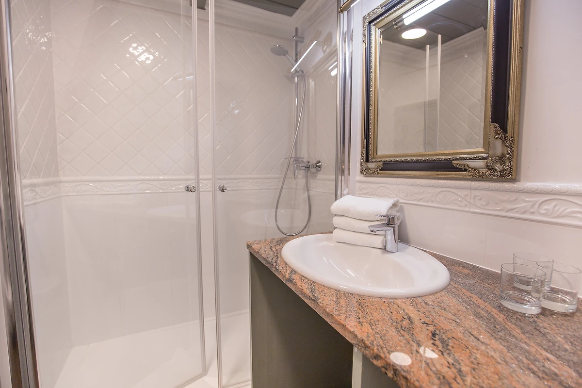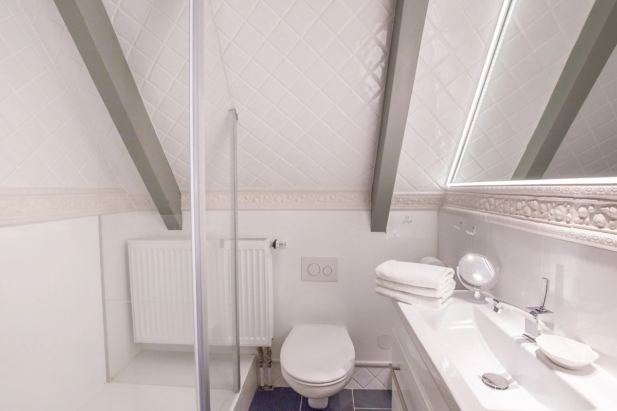 Zudem verfügt das Erdgeschoss über ein geräumiges Duschbad mit WC und Tageslicht. Über das zur Wohnung gehörende geräumige Treppenhaus erreichen Sie die zwei im Dachgeschoss gelegenen Schlafzimmer mit Doppelbetten. Jedes Schlafzimmer im DG verfügt über ein eigenes Duschbad/WC.