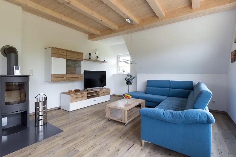 Der Wohnbereich ist in einem modernen und freundlichen Stil eingerichtet. Hier befindet sich eine grosszügige Couch. Zur Ausstattung gehört ebenso ein Smart-TV mit Internetverbindung. Um den Abend so richtig gemütlich zu gestalten, kann ein Feuer im Kaminofen angezündet werden.
