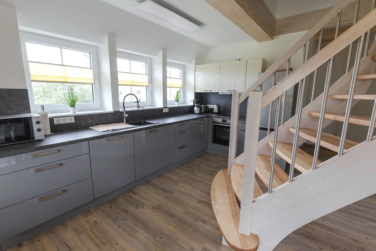 Die im amerikanischen Stil gestaltete Küche ist mit einem Ceran- Kochfeld, einem Backofen und einer Mikrowelle ausgestattet. Ebenso befindet sich hier eine Kühl-Gefrier-Kombination.