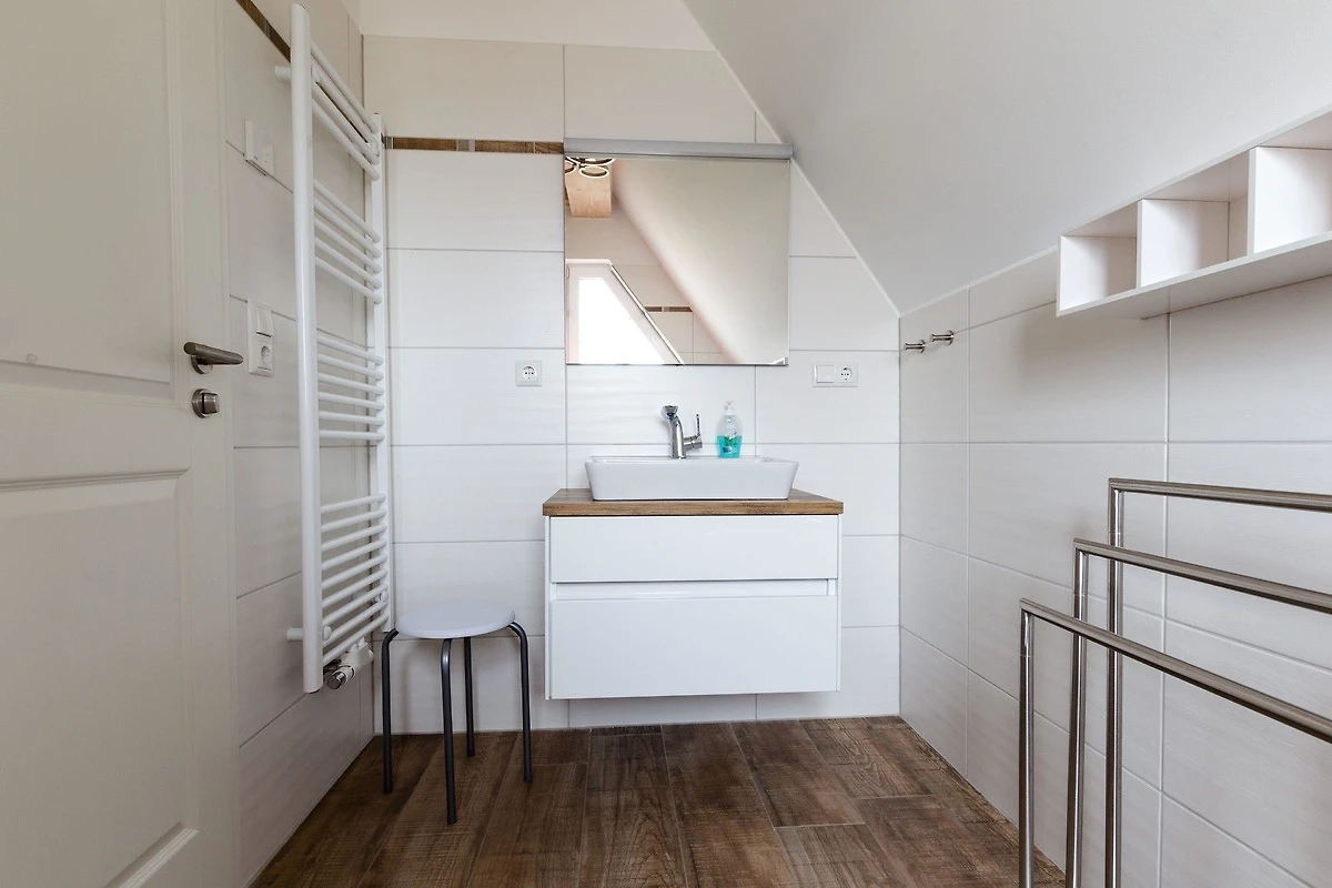Die Badezimmer sind mit einem modernen Waschtisch und einer begehbaren Dusche ausgestattet.