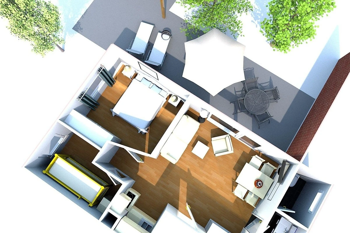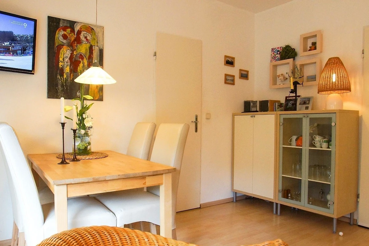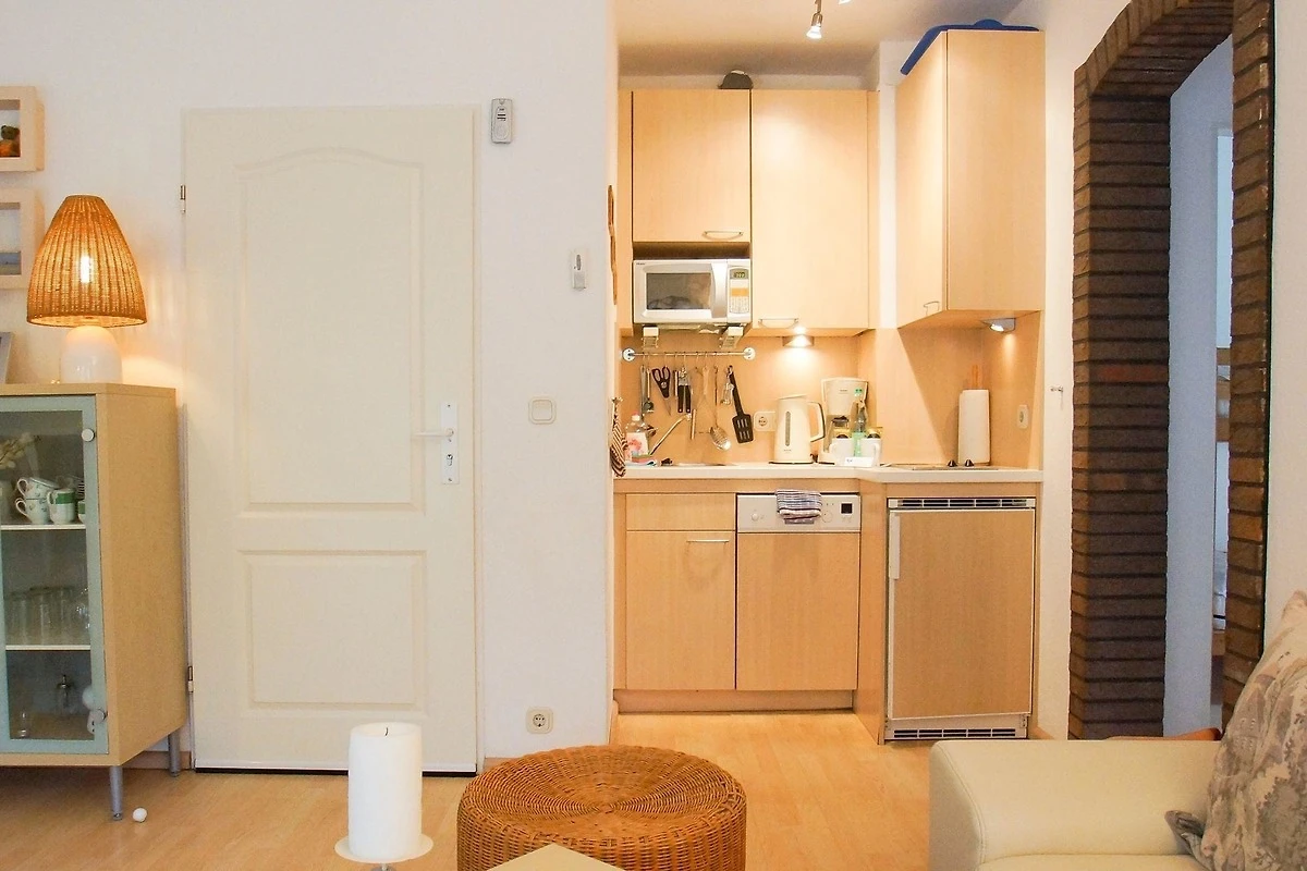 Das 3-Raum-Apartment im Erdgeschoss bietet auf 40 qm Platz für bis zu 4 Personen. Der grosszügige Wohnbereich beherbergt eine gut ausgestattete Küchenzeile und eine gemütliche Sofaecke. Zwei separate Schlafzimmer mit einem Doppelbett und zwei Einzelbetten garantieren erholsame Nächte. Das moderne Bad ist mit einer ebenerdigen Dusche ausgestattet.