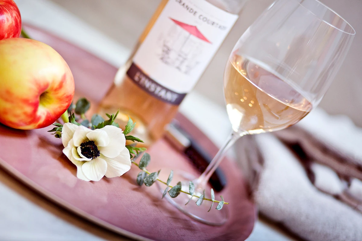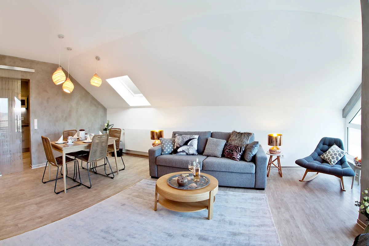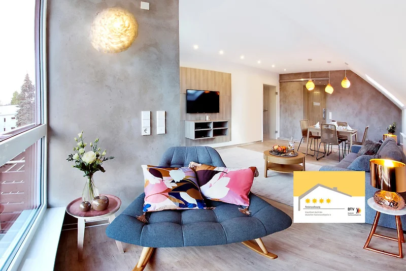 Lichtdurchflutet präsentieren sich Wohn- und Esszimmer mit üppiger Fensterfront unter dem Dach. Ein Sessel in der Lounge-Ecke lädt zum Entspannen ein - für den Kaffee am Morgen, das Glas Wein am Abend oder ein gutes Buch. Gegenüber des kuscheligen, hochwertigen Sofas befindet sich die Cine-Wall mit Flachbild-TV. Die Kissen stammen von Westwing, ein Materialmix mit Samt, Strick und Fell. Über dem grosszügigen Holztisch von Studio Copenhagen spenden die Pendelleuchten von Graypants sanftes Licht. Auf dem West-Balkon, mit Blick zum Wald, bieten sich Sitzmöglichkeiten für zwei bis drei Personen.
