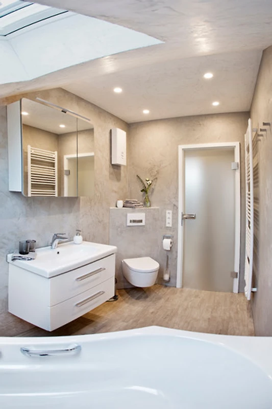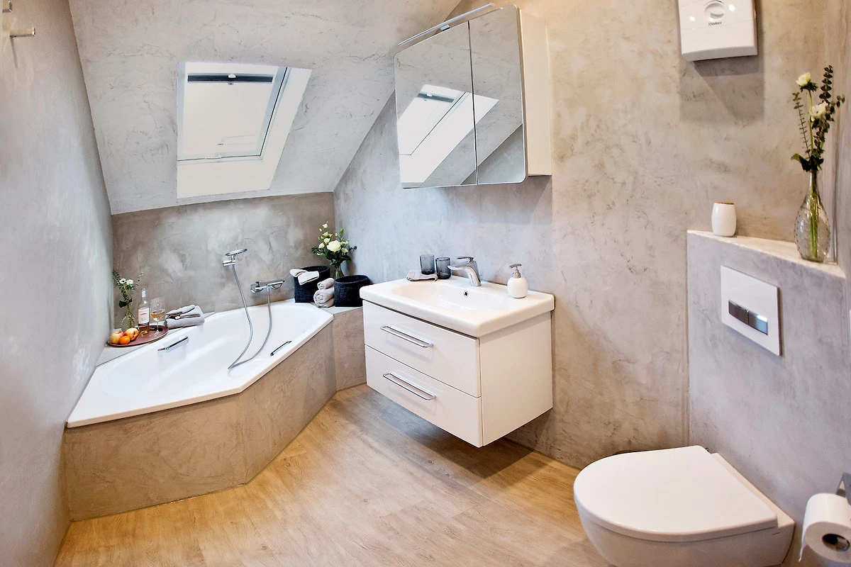 Im neuen Bad befindet sich eine komfortable Dusch-Badewanne, ein Waschbecken und WC. Ausserdem: ein grosser Spiegelschrank, ein Kosmetik-Spiegel, Föhn, Handtücher und Vorleger. Das Bad kann mit Tageslichtfenster gut belüftet werden und ist lichtdurchflutet und einladend.