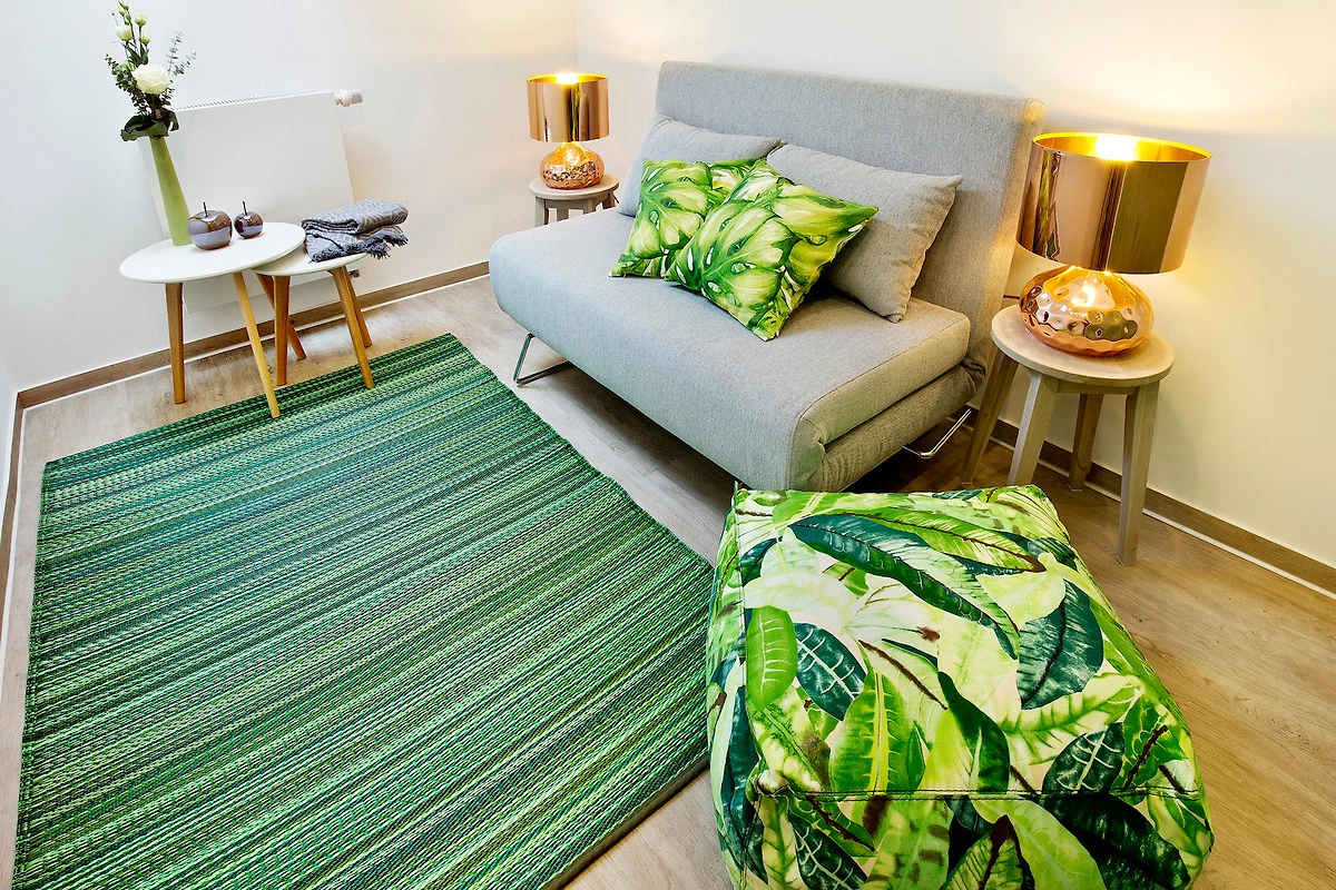 Das grosse Schlafzimmer beherbergt ein luxuriöses Boxspringbett mit Wildeichen-Rahmen (Liegefläche 180 x 200 cm) für zwei Personen und dazu passendem Mobiliar - Nachttische und ein geräumiger Schrank. Eine Wand wurde in elegantem Violett gestrichen. Die Farbe wirkt ausgleichend und regenerierend. Im zweiten Schlafzimmer befindet sich ein Schlafsofa (Liegefläche 130 x 200 cm) vor grüner Wand.