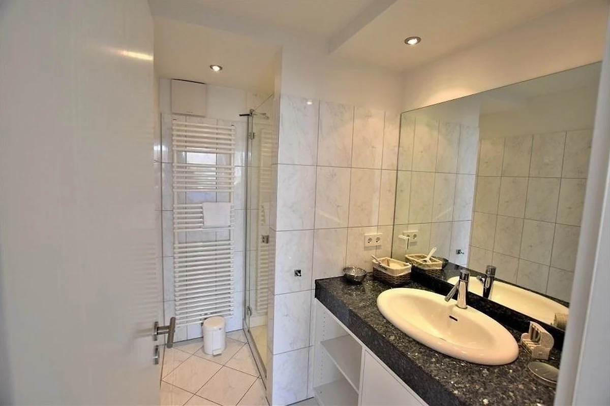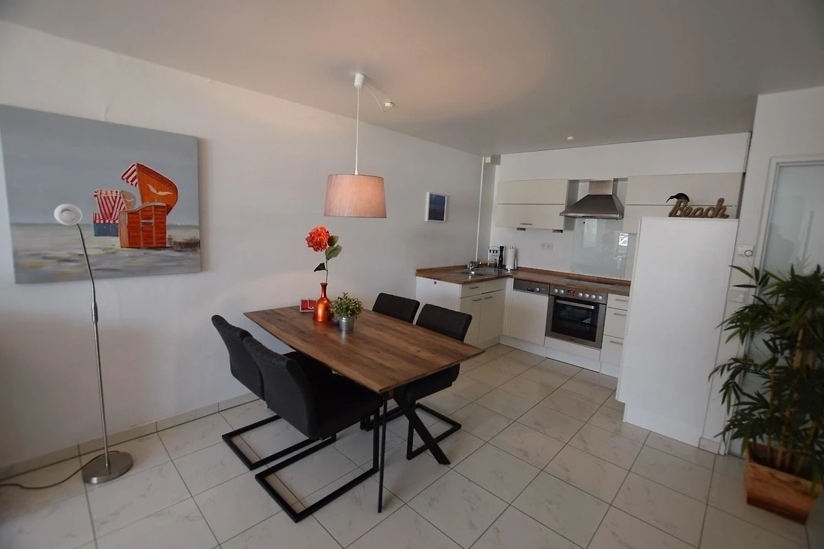 Die hochwertig ausgestattete Ferienwohnung im 1. Obergeschoss bietet auf 60 qm einen einladenden Wohn- und Essbereich mit integrierter Küche. Der Schlafraum ist mit einem Doppelbett (160x200 cm) ausgestattet und sorgt für erholsame Nächte. Ein modernes Bad mit Dusche sowie ein separates Gäste-WC ergänzen die Räumlichkeiten. Ein grosser Westbalkon ermöglicht einen herrlichen Meerblick und lädt zum Entspannen ein.