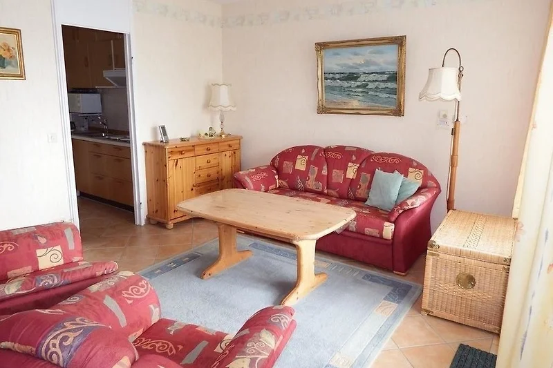 Die Ferienwohnung für zwei Personen in der Anlage Hohes Ufer bietet eine gemütliche Wohnatmosphäre. Das Wohnzimmer verfügt über eine stilvoll integrierte Schlafnische mit einem komfortablen Bett. Im vorderen Bereich der Wohnung befindet sich die Küche, die mit den notwendigen Utensilien ausgestattet ist. Das Bad ist mit einer Dusche und einer Waschmaschine ausgestattet, um den Aufenthalt noch angenehmer zu gestalten. Der Balkon mit Terrassenmöbeln ermöglicht entspannte Stunden an der frischen Luft. Für Komfort sorgt ein Parkplatz direkt vor dem Haus. Bettwäsche kann gegen Gebühr bereitgestellt oder selbst mitgebracht werden. Haustiere sind erlaubt. Bitte beachten, dass in der Unterkunft kein Internet verfügbar ist.