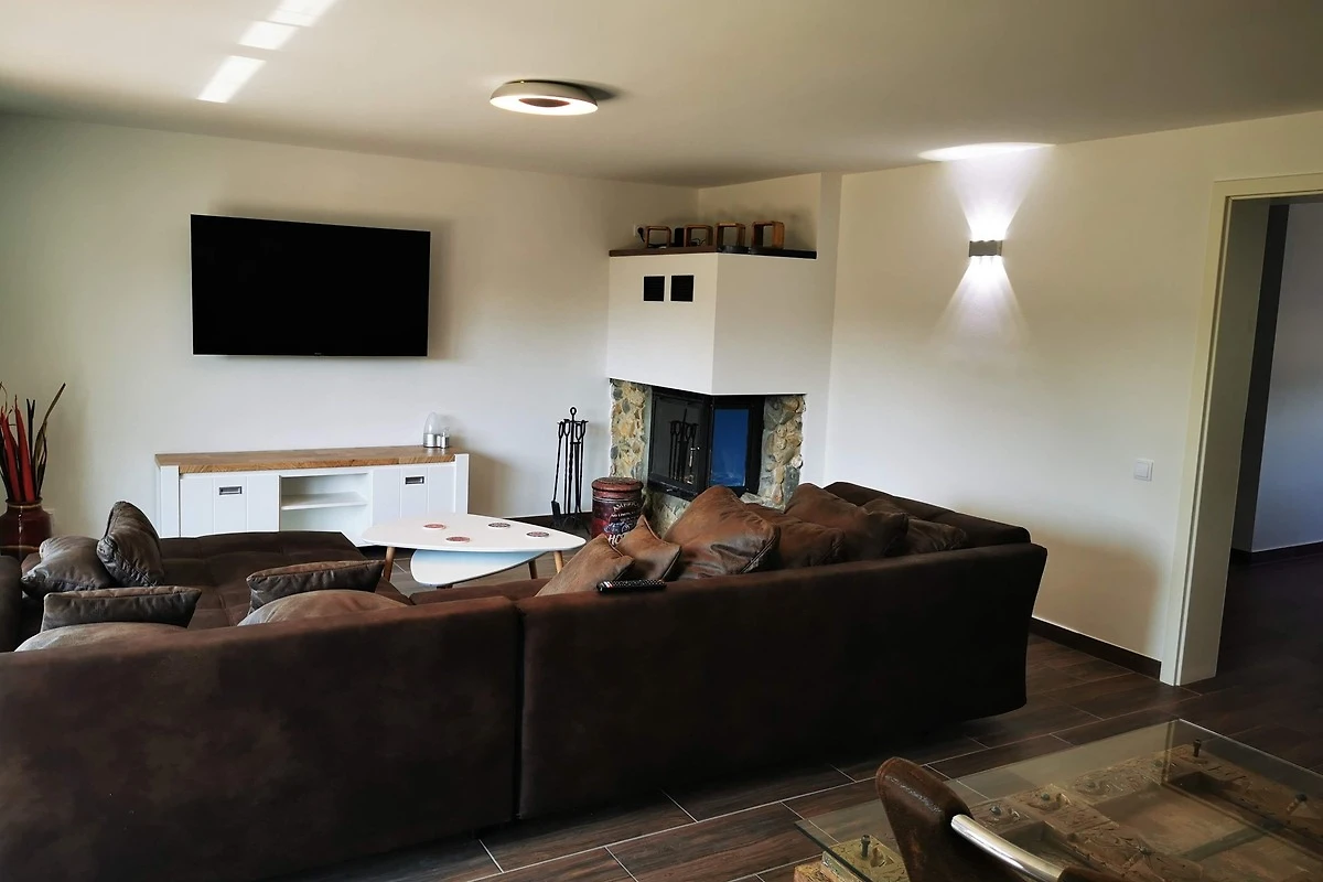 Das Wohnzimmer bietet ein grosses, gemütliches Sofa mit Sitzmöglichkeiten für bis zu 6 Personen, einen Kaminofen (Kaminholz wird im Winter kostenlos zur Verfügung gestellt) sowie ein 55 Zoll UHD Smart-TV. Gemeinsam kann man dort mit der Familie oder mit Freunden vor dem Kamin ein Glas Wein trinken oder auch den Abend mit einem Film ausklingen lassen. Auf Anfrage wird Ihnen ein Netflix-Konto für die Zeit Ihres Aufenthalts zur Verfügung gestellt.