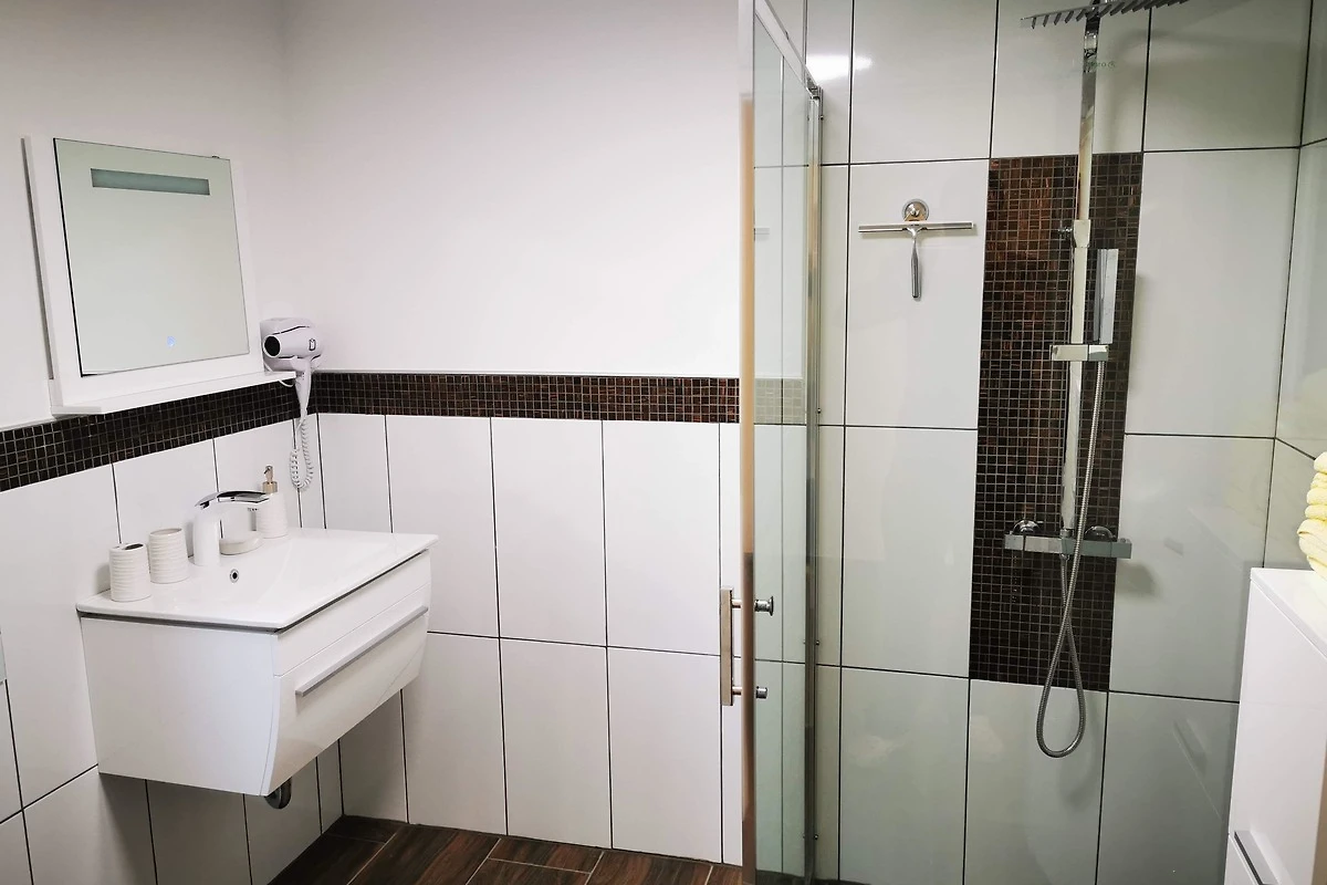 Das Erdgeschoss vereint Küche, Esszimmer und Wohnzimmer in einem grossen, gut beleuchteten Raum, der unsere Gäste die häuslichen Aktivitäten gemeinsam geniessen lässt, da die Wohnfläche auf einer Ebene verteilt ist. Beide Schlafzimmer verfügen über ein eigenes Bad, jeweils mit einer grossen, offenen Regendusche ausgestattet. Somit ist dafür gesorgt, dass die Gäste sich in den frühen Morgenstunden beim Gang ins Badezimmer nicht gegenseitig stören oder behindern.