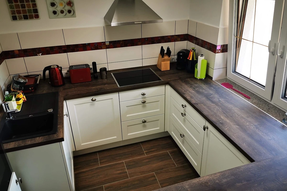 Unsere offene, modern und grosszügig ausgestattete Küche bietet Geschirr, Töpfe und alles andere, was Sie zum Kochen brauchen. Der Elektroherd mit Ceran Kochfeld und Backofen, der Kühlschrank mit Gefrierfach, die Geschirrspülmaschine, die Mikrowelle, die Kaffeemaschine, der Toaster, etc… sind allesamt qualitativ hochwertige Geräte namhafter Hersteller. Kochutensilien, Gewürze, Kaffeekapseln, Reinigungsmittel, etc… sind immer vorhanden. Als kleines Extra befinden sich in der Küche zwei Barhocker, wo Sie morgens einen Kaffee trinken können oder abends Ihren Geliebten beim Kochen zuschauen können.