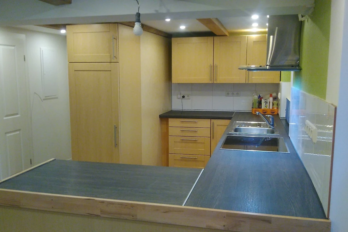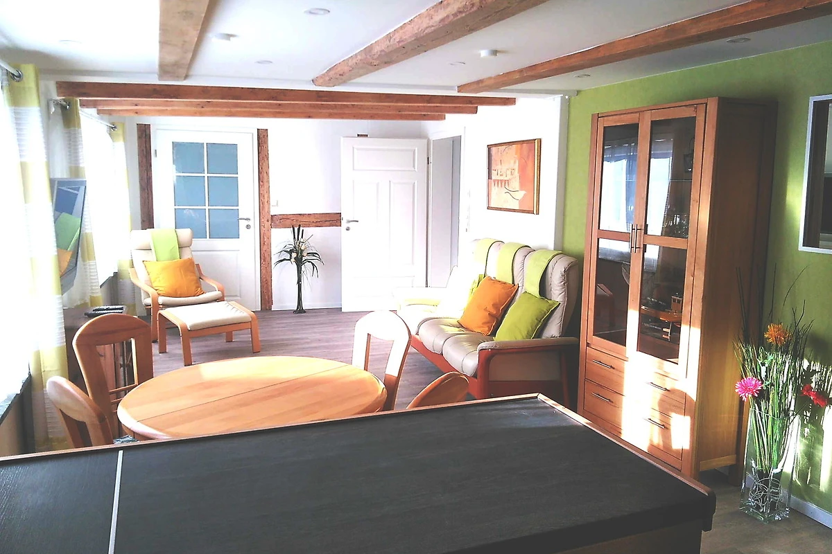 Die frisch sanierte Altbauwohnung verfügt unter den schönen Fachwerkbalken über eine Deckenhöhe von ca. 2,00 bis 2,10m .
