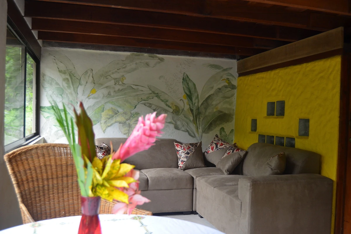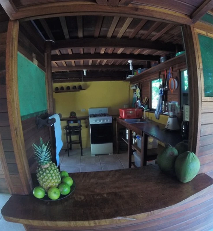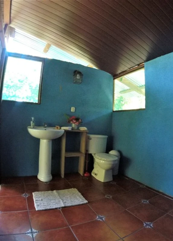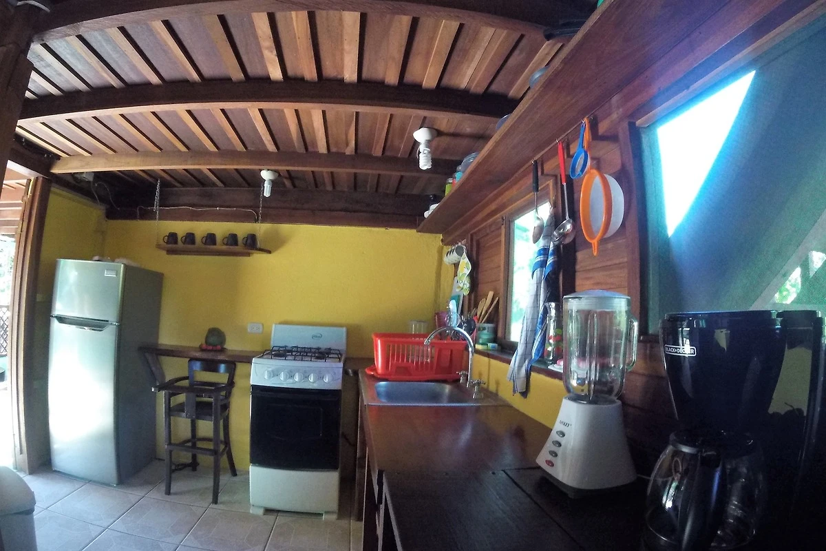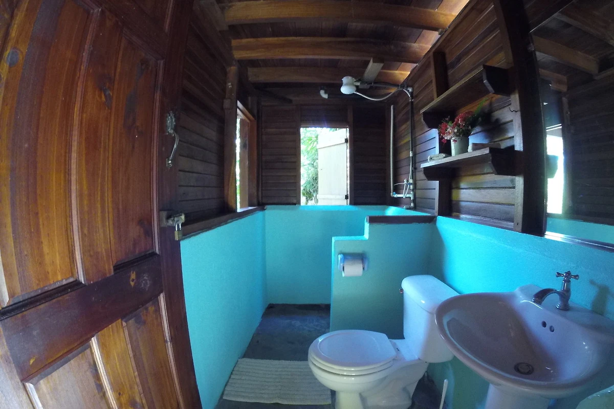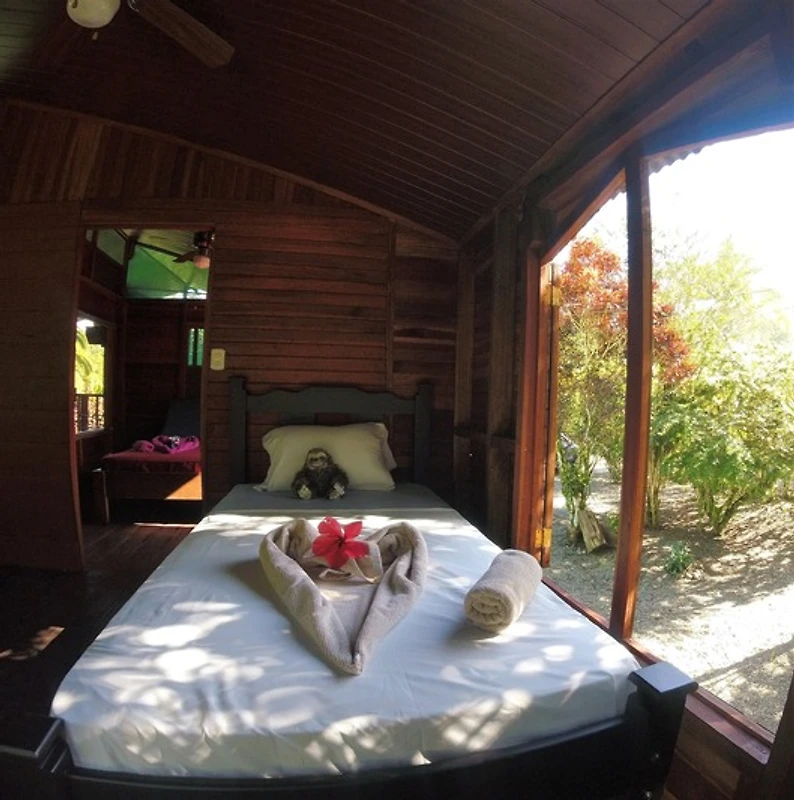 Die typisch costa ricanische Hütte verfügt über 2 Schlafzimmer im Obergeschoss mit 3 Betten. Dort befindet sich auch die grosse Veranda und eine kleines Bad mit WC.