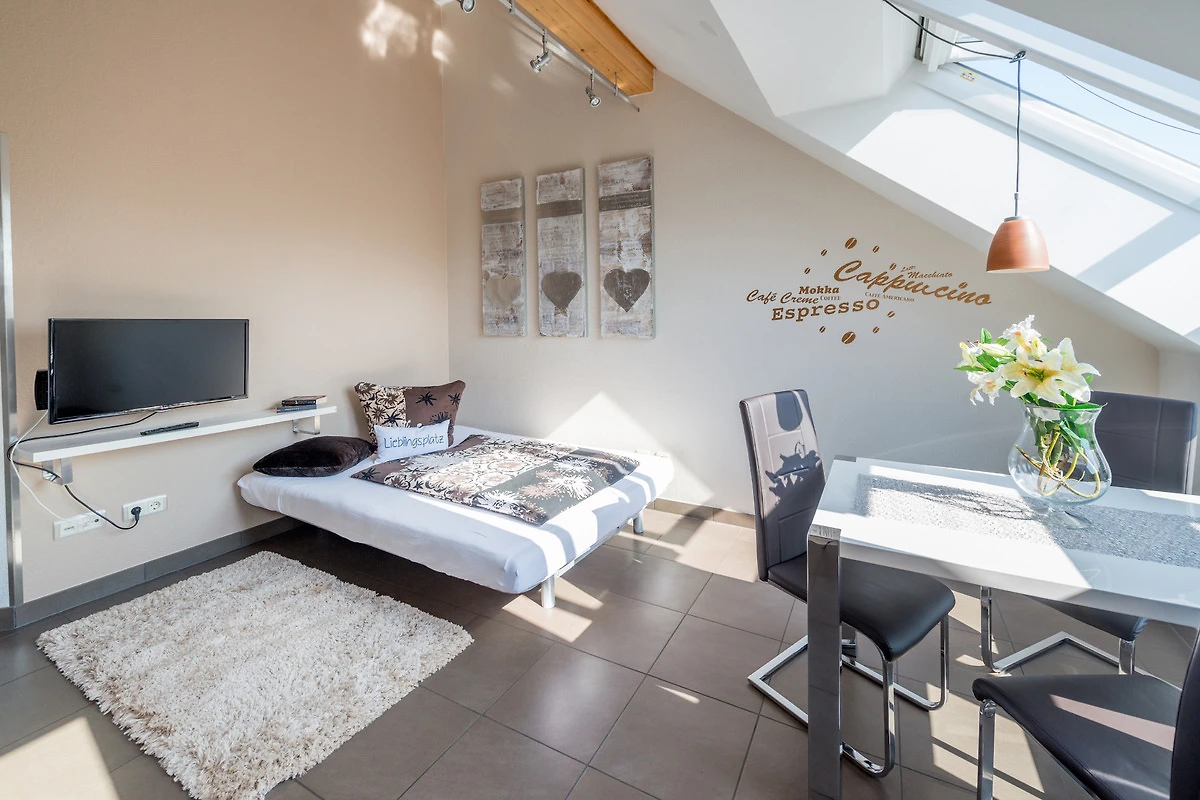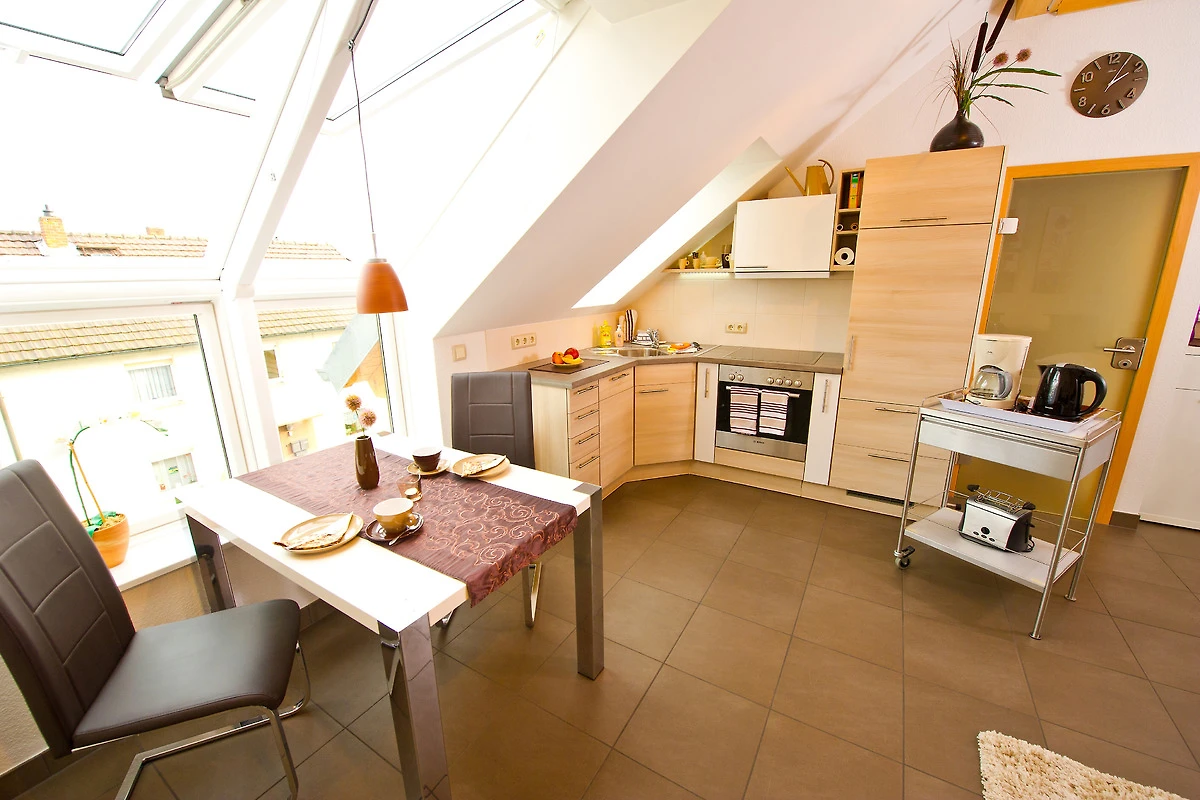 Kühlschrank mit Gefrierschrank, Geschirrspülmaschine, 4-Platten-Zerankochfeld, Backofen, Kaffeemaschine, Wasserkocher, Toaster, Mikrowelle auf Wunsch