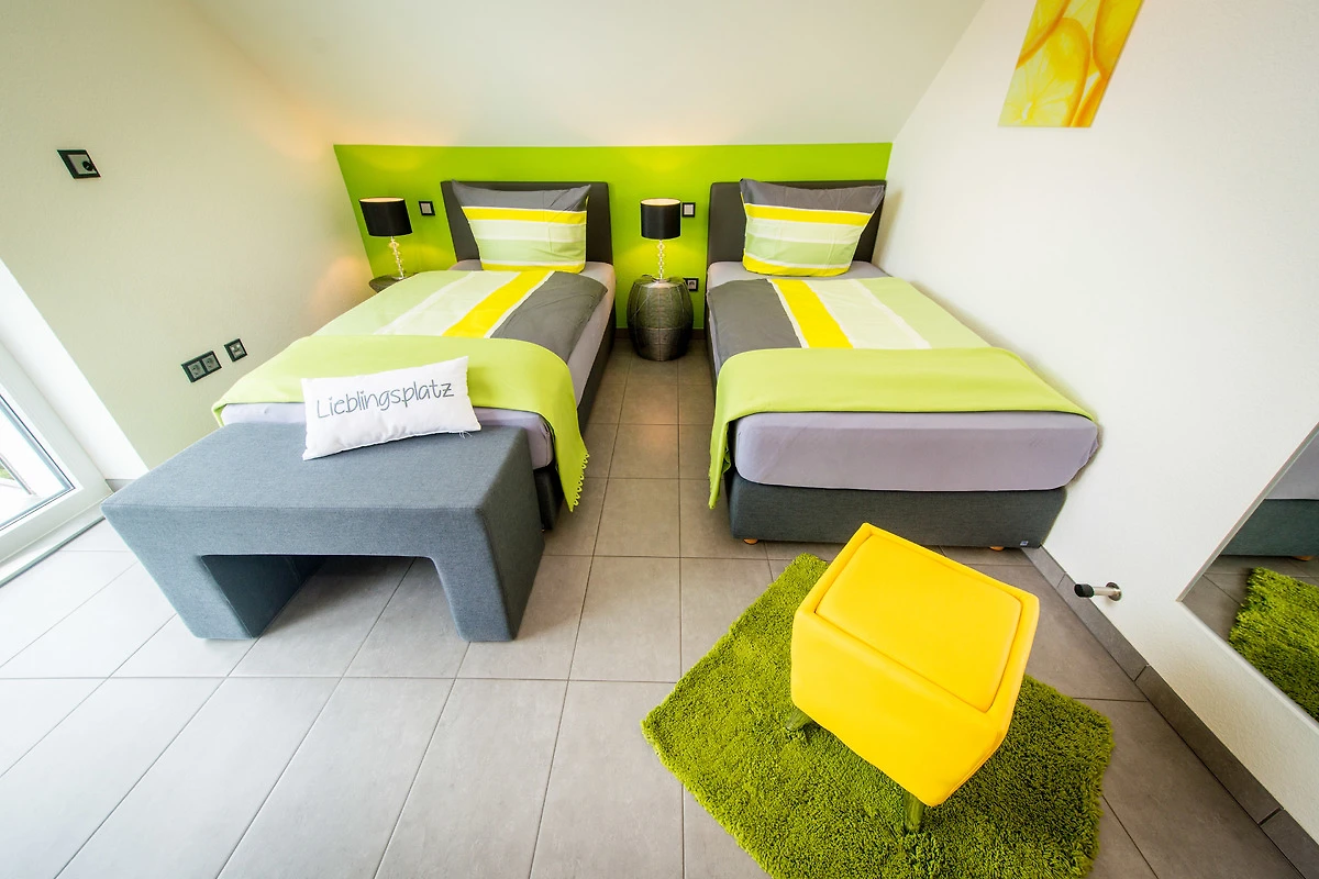 Schlafen 2: Zweibett-Zimmer mit 2 getrennten Einzelbetten (je 1x2m).