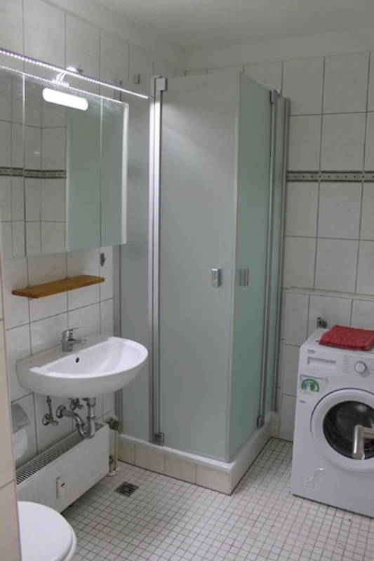 Das Badezimmer ist hell gefliest und mit einer umlaufenden Bordüre versehen. Ein Dusche mit Glaskabine, ein beleuchteter Spiegelschrank und durchdachte Ablageflächen gehören neben einer Waschmaschine und einem Fön zu den besonderen Vorzügen des Raumes.