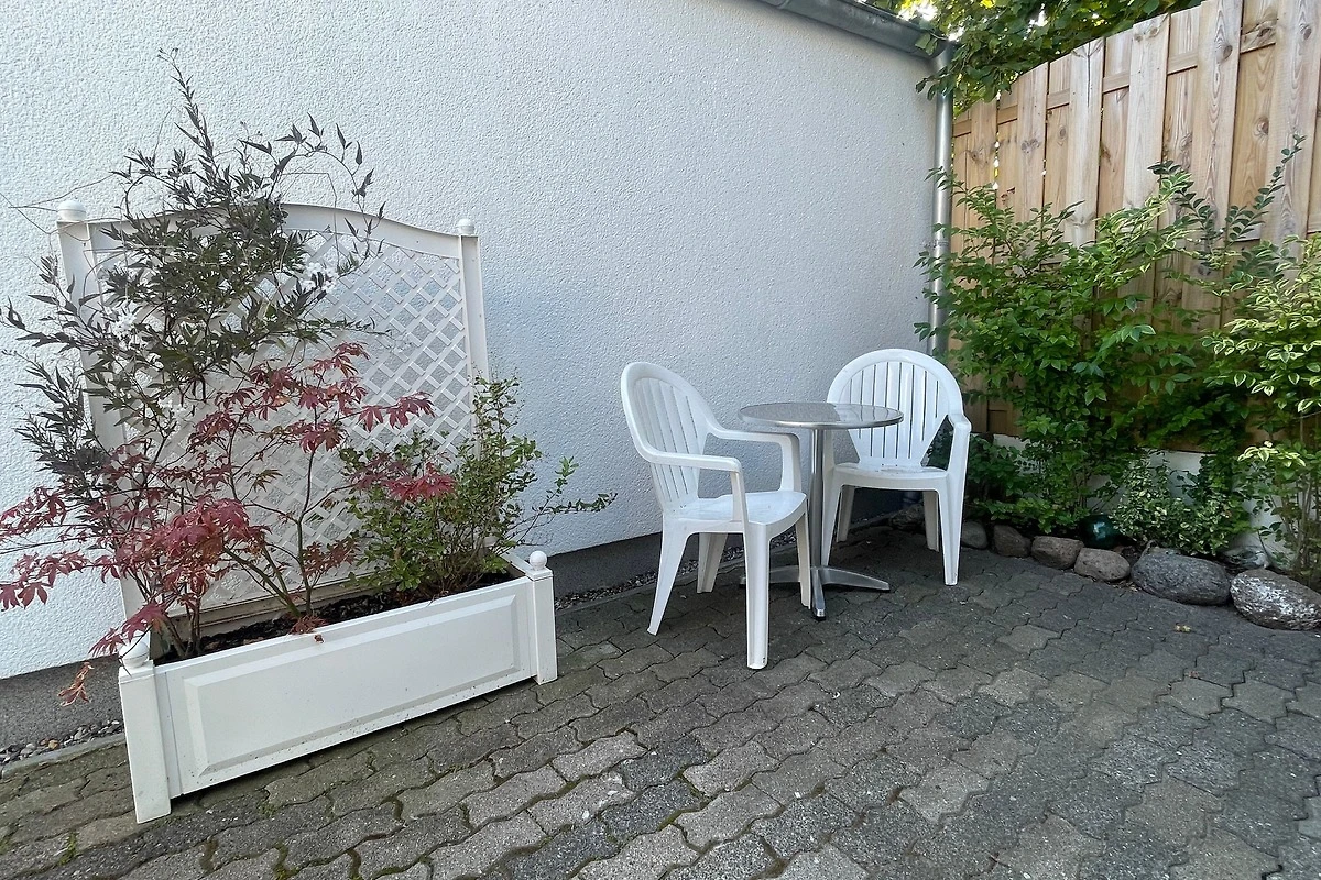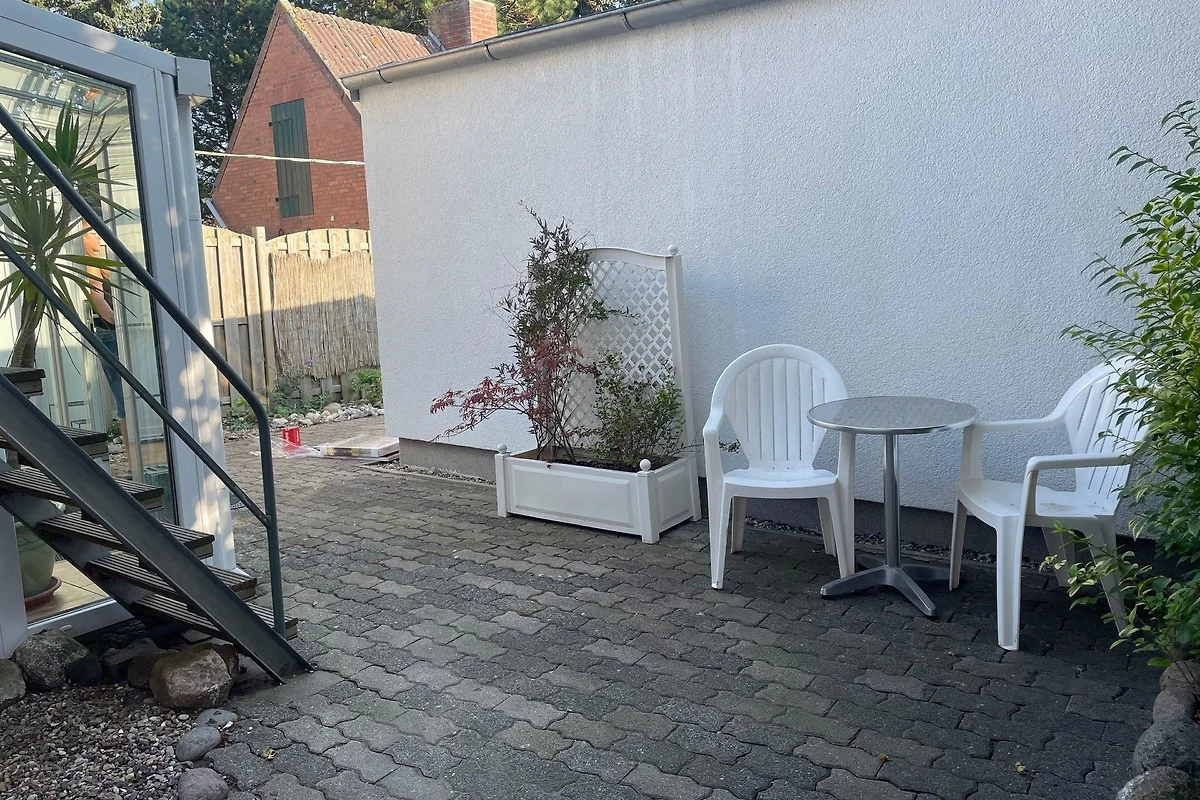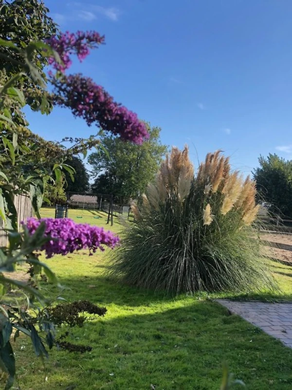 Im Innenhof ist eine kleine Sitzecke, weiter geht es in den Garten mit bestem Ausblick über die Felder. Dort ist eine weitere gepflasterte Ecke mit Tisch, Stühlen und Liegen für Grillabende und Sonnenbäder. Der Garten lädt zum Faulenzen ein. Ein Parkplatz befindet sich direkt vor der Tür. Ein Abstellraum für Fahrräder ist ebenfalls vorhanden.