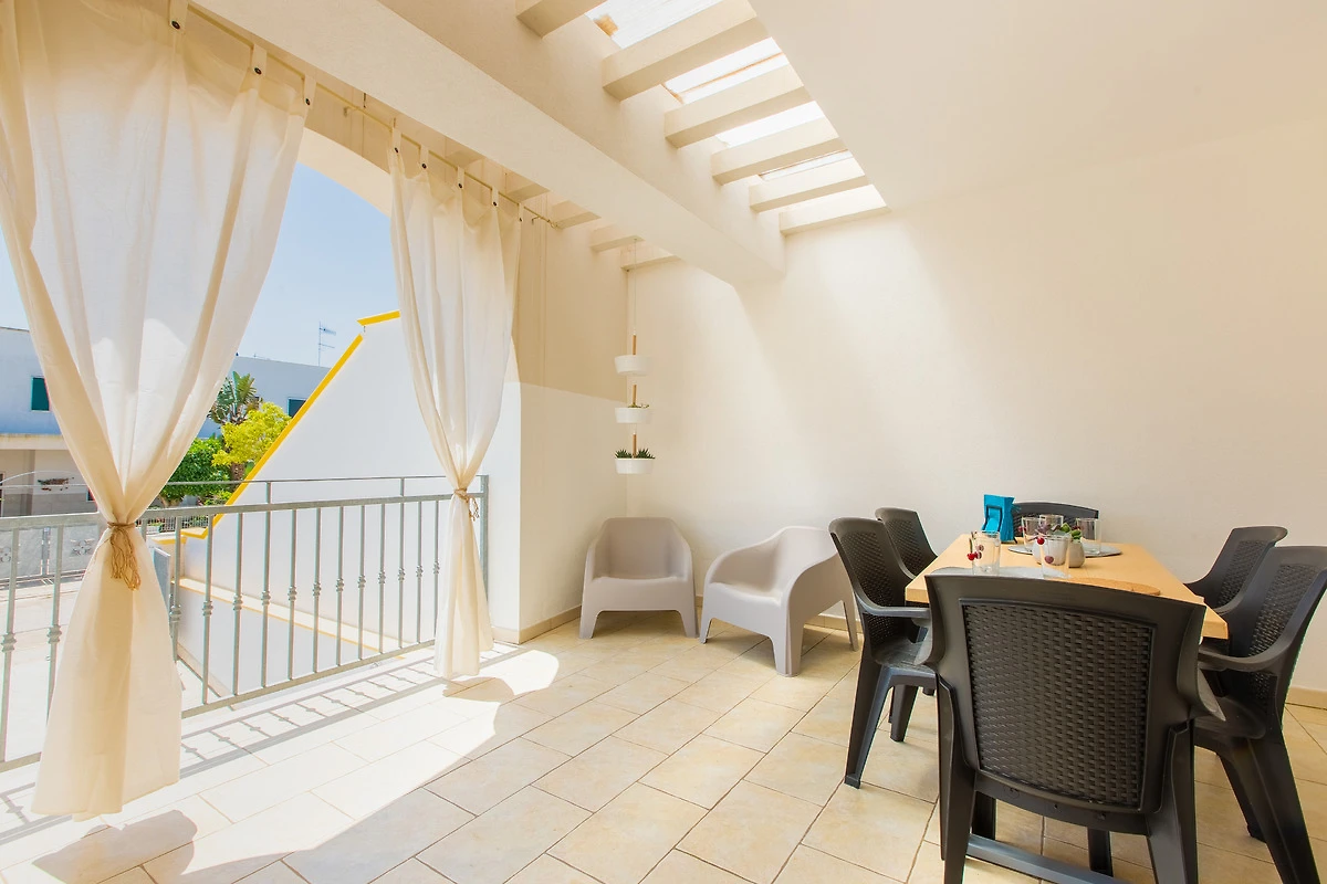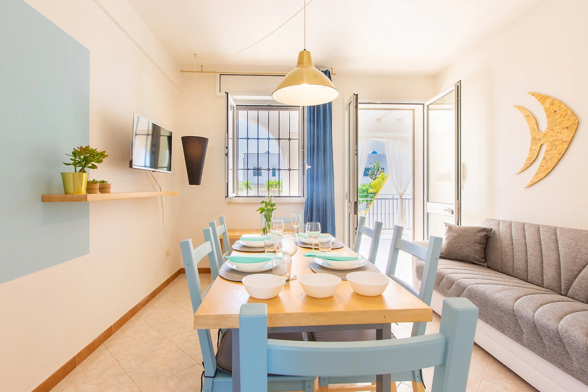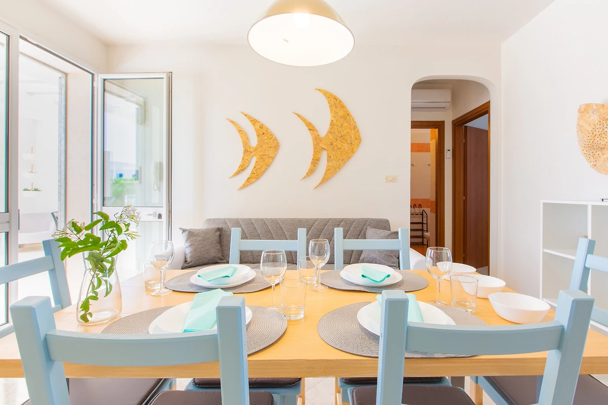 Die Unterkunft ist Teil eines Komplexes von vier Apartments mit insgesamt 24 Betten. Der Strand kann zu Fuss erreicht werden und ist komplett sandig, wobei sich freie Strandecken mit einem ausgestatteten Strand abwechseln. Das Meer ist klar und der Meeresboden ist niedrig. Jedes Apartment verfügt über eine Veranda zur privaten Nutzung. Das Cristallo Apartment befindet sich im ersten Stock und bietet eine Panorama-Veranda, einen Balkon und Zugang zur Terrasse mit Meerblick. Es ist zum gemütlichen Essen im Freien eingerichtet und bietet Lesestühle. Klimaanlage auf dem Flur in der Nähe des Schlafbereichs.