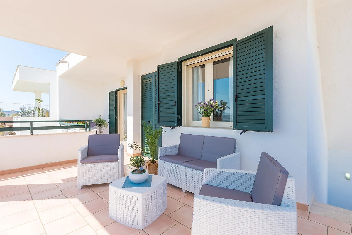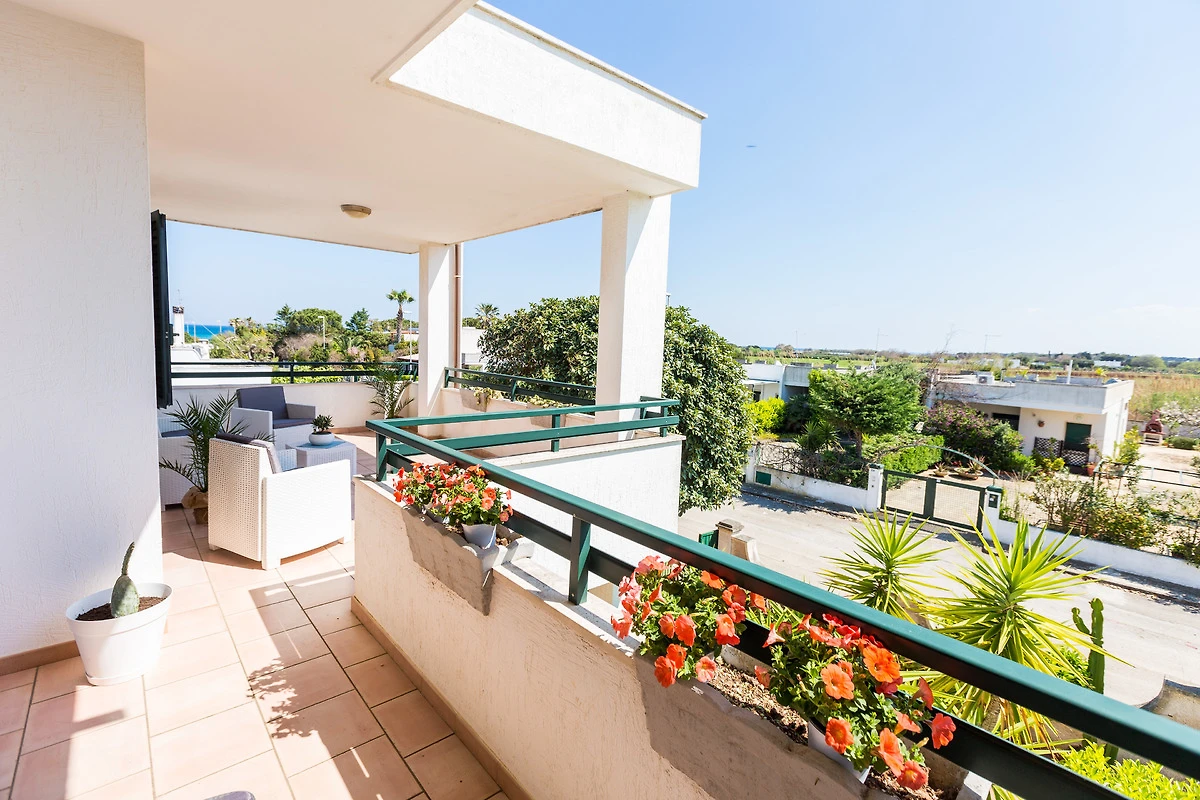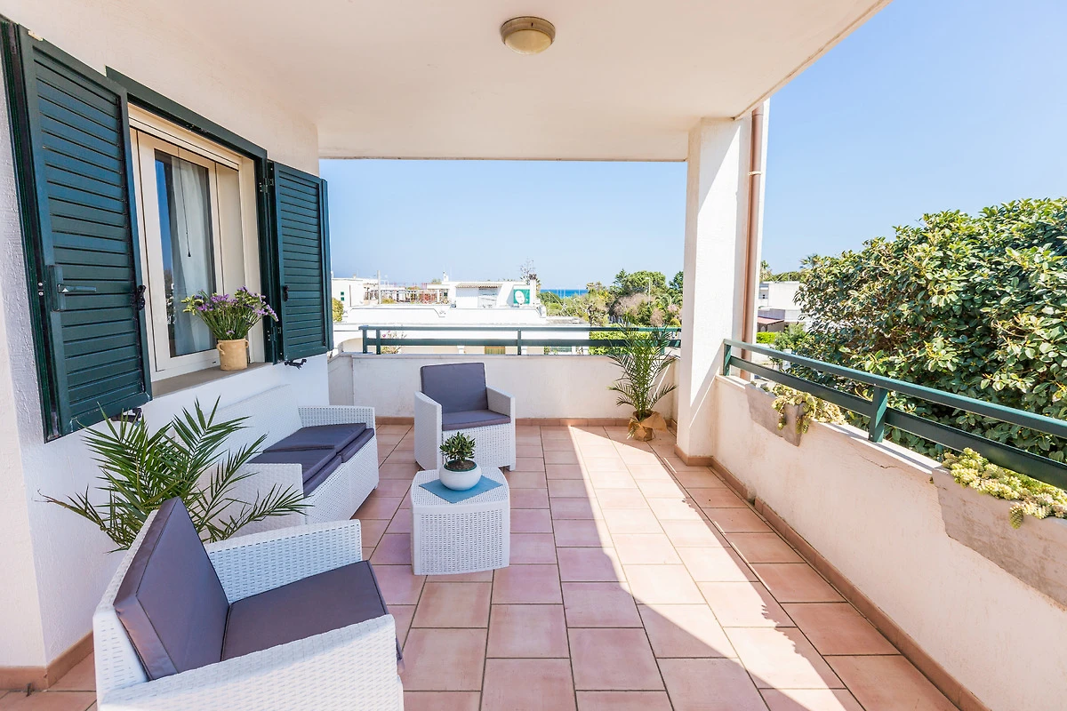 Die Wohnung verfügt über drei Aussenbereiche, von denen zwei Veranden auf zwei Seiten des Grundstücks angeordnet sind, um zu jeder Tageszeit Kühle zu gewährleisten. Auf dem Dach befindet sich eine Terrasse mit Meerblick. Im Erdgeschoss ist der Parkplatz bewacht.