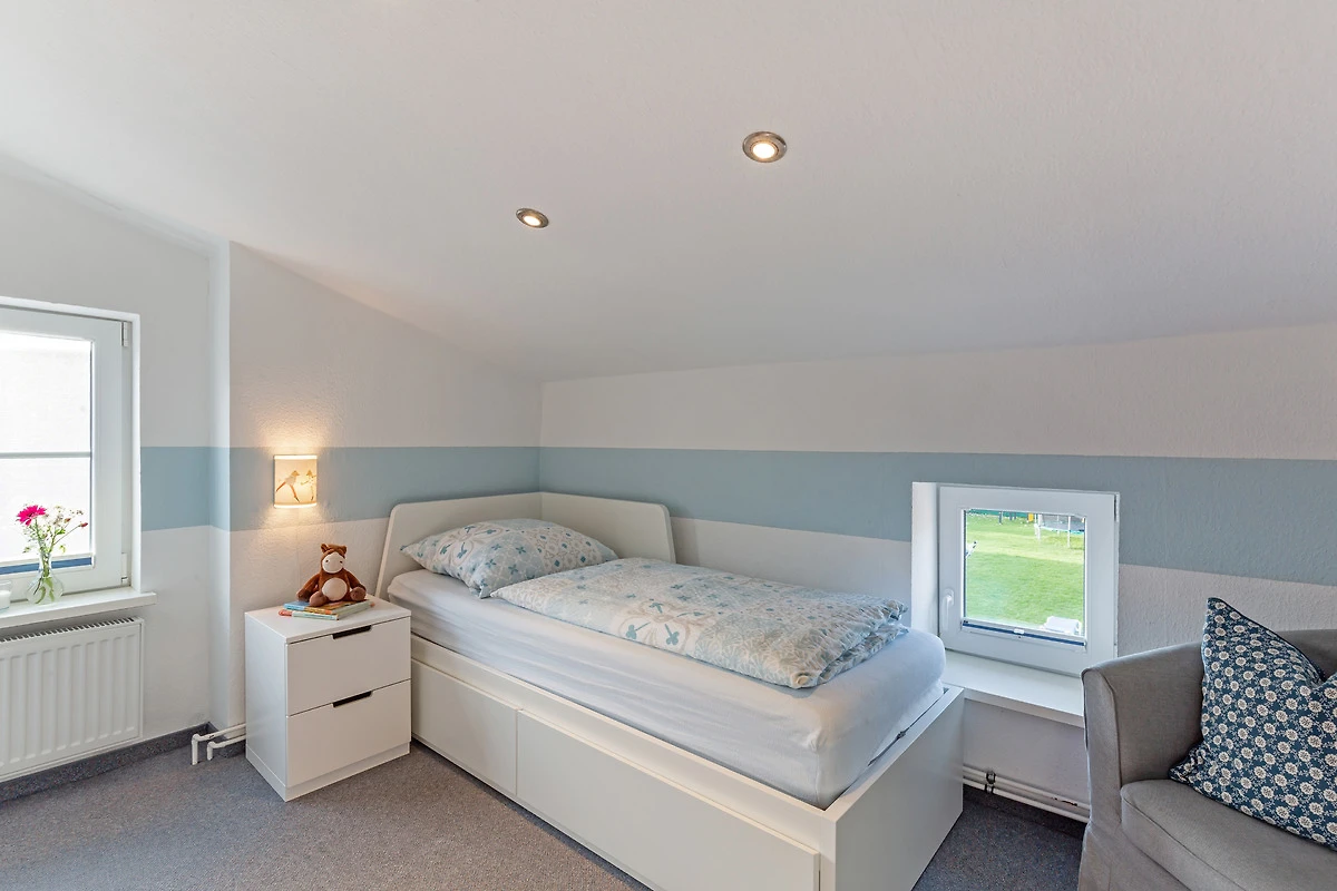 Die Wohnung Gänseblümchen liegt im ersten Stock des ehemaligen Bauernhauses auf dem Ferienhof Marquardt. Die Wohnung verfügt über ein Elternschlafzimmer, ein Kinderschlafzimmer mit einem Einzelbett, das zu einem Doppelbett ausziehbar ist. Ein Babybettchen kann in jedes der beiden Schlafzimmer gestellt werden. Weiterhin gibt es ein Duschbad und einen Wohnbereich mit Küchenzeile, Essbereich und frz. Balkon. Im Garten stehen Ihnen mehrere Sitzmöglichkeiten zur Verfügung.