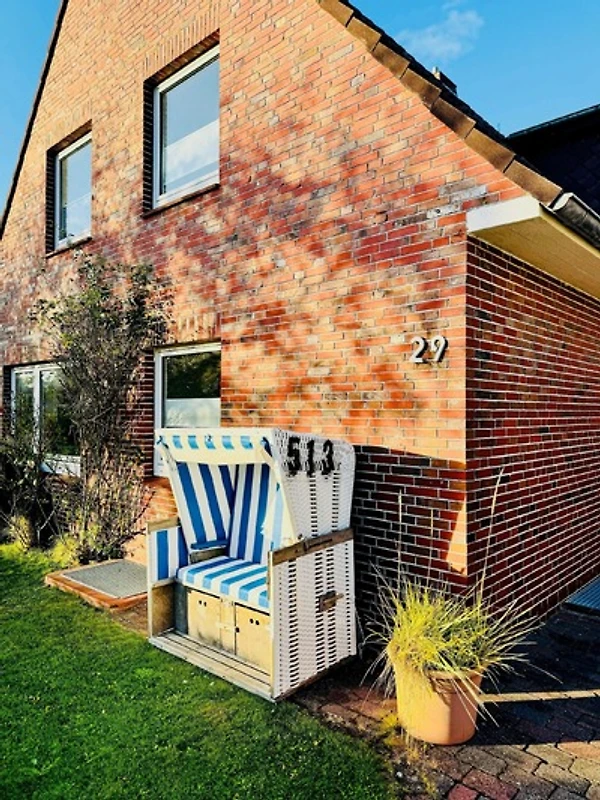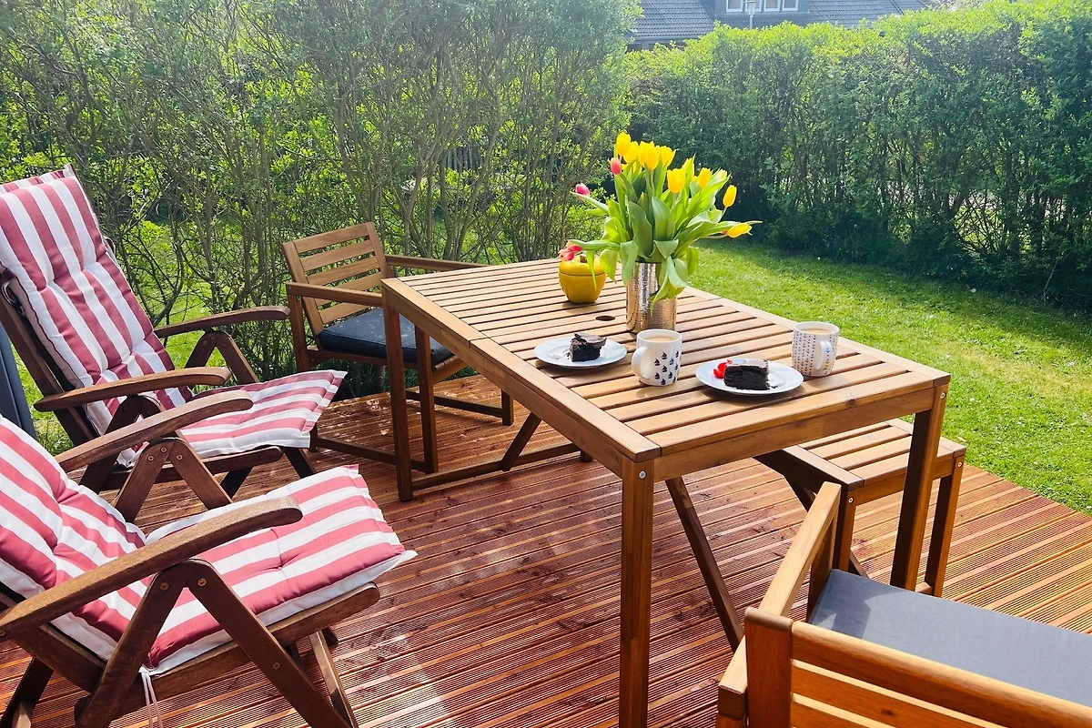 Die Gartenmöbel auf der Terrasse sowie der typisch blau weisse Sylt Strandkorb stehen von Mai bis Ende September zur Verfügung.