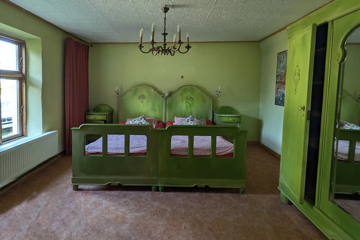 ​Speziell im grünen Schlafzimmer liegt der Charme des Alters knallhart vor euch, Betten und Schrank scheinen aus dem benachbarten Gutshaus geklaut.